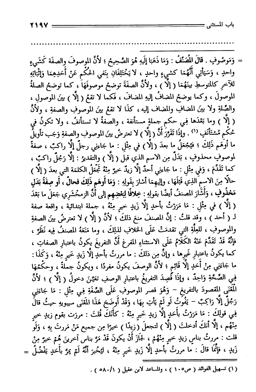 وموصوف. قال المصنّف: وما ذهبا إليه هو الصّحيح؛ لأنّ الموصوف والصفة كشيء واحد، وسيأتي أنّهما كشيء واحد، لا يختلفان بنفي الحكم عن أحدهما وإثباته للآخر كالمتوسط بينهما (إلّا)، ولأنّ الصفة توضح موصوفها، كما توضح الصلة الموصول، وكما يوضح المضاف إليه المضاف، فكما لا تقع (إلّا) بين الموصول، والصّلة ولا بين المضاف والمضاف إليه، كذا لا تقع بين الموصوف والصفة، ولأنّ (إلّا) وما بعدها في حكم جملة مستأنفة، والصفة لا تستأنف، ولا تكون في حكم مستأنف (¬1). وإذا تقرّر أنّ (إلّا) لا تعترض بين الموصوف والصفة وجب تأويل ما أوهم ذلك؛ فيجعل ما بعد (إلّا) في مثل: ما جاءني رجل إلّا راكب، صفة لموصوف محذوف، بدل من الاسم الذي قبل (إلّا) والتقدير: إلّا رجل راكب، كما تقدّم، وفي مثل: ما جاءني أحد إلّا زيد خير منه تجعل الكلمة التي بعد (إلّا) حالا من الاسم الذي قبلها، وإليهما أشار بقوله: وما أوهم ذلك فحال، أو صفة بدل محذوف، وأشار المصنف أيضا بقوله: خلافا لبعضهم إلى أنّ الزمخشري جعل ما بعد (إلّا) في مثل: ما مررت بأحد إلّا زيد خير منه، جملة ابتدائية، واقعة صفة لـ (أحد)، وقد قلت: إنّ المصنف منع ذلك؛ لأنّ (إلّا) لا تعترض بين الصفة والموصوف، للعلّة التي تقدمت على الخلاف لذلك، وما منعه المصنف فيه نظر، فإنّه قد تقدّم عنه الكلام على الاستثناء المفرغ أنّ التفريغ يكون باعتبار الصفات، كما يكون باعتبار غيرها، وإنّ من ذلك: ما مررت بأحد إلّا زيد خير منه، وكذا: