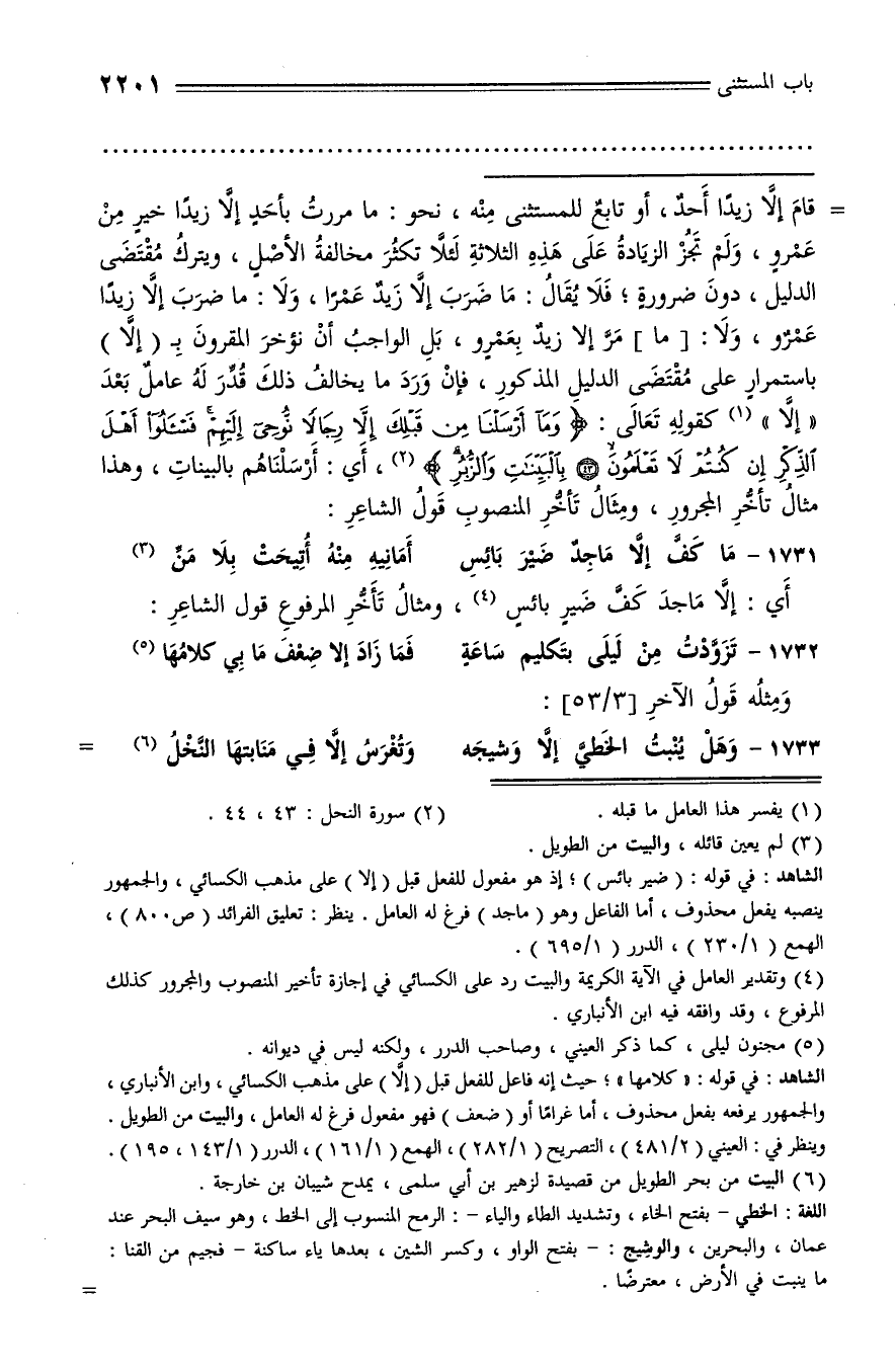 قام إلّا زيدا أحد، أو تابع للمستثنى منه، نحو: ما مررت بأحد إلّا زيدا خير من عمرو، ولم تجز الزيادة على هذه الثلاثة لئلّا تكثر مخالفة الأصل، ويترك مقتضى الدليل، دون ضرورة؛ فلا يقال: ما ضرب إلّا زيد عمرا، ولا: ما ضرب إلّا زيدا عمرو، ولا: [ما] مرّ إلا زيد بعمرو، بل الواجب أن نؤخر المقرون بـ (إلّا) باستمرار على مقتضى الدليل المذكور، فإن ورد ما يخالف ذلك قدّر له عامل بعد «إلّا» (¬1) كقوله تعالى: وَما أَرْسَلْنا مِنْ قَبْلِكَ إِلَّا رِجالًا نُوحِي إِلَيْهِمْ فَسْئَلُوا أَهْلَ الذِّكْرِ إِنْ كُنْتُمْ لا تَعْلَمُونَ (43) بِالْبَيِّناتِ وَالزُّبُرِ (¬2)، أي: أرسلناهم بالبينات، وهذا مثال تأخّر المجرور، ومثال تأخّر المنصوب قول الشاعر: