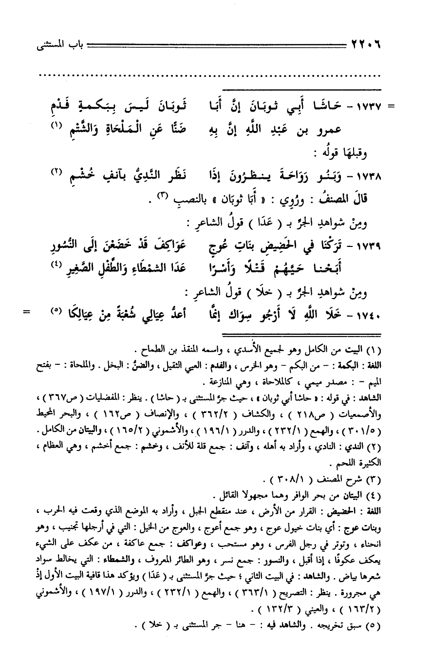 الشاهد: في قوله: «حاشا أبي ثوبان»، حيث جرّ المستثنى بـ (حاشا). ينظر: المفضليات (ص 367)، والأصمعيات (ص 218)، والكشاف (2/ 362)، والإنصاف (ص 162)، والبحر المحيط (5/ 301)، والهمع (1/ 232)، والدرر (1/ 196)، والأشموني (2/ 165)، والبيتان من الكامل.