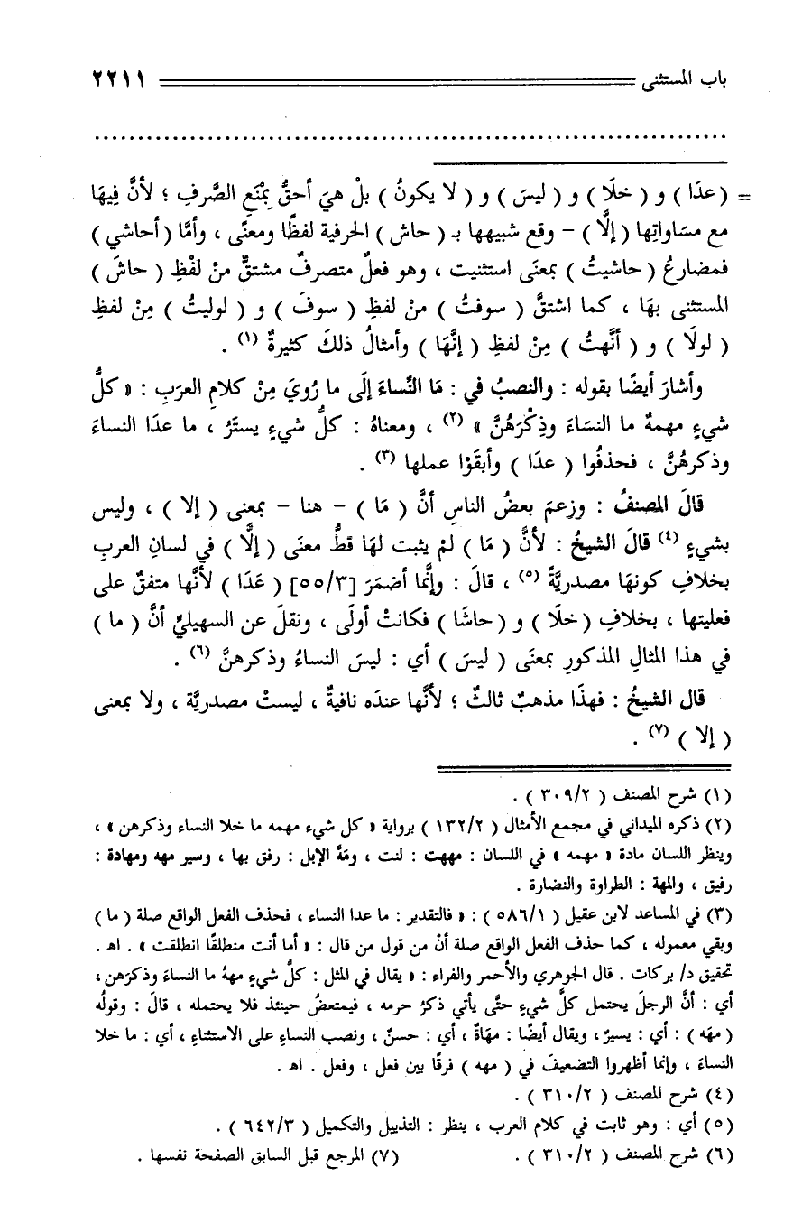 (عدا) و (خلا) و (ليس) و (لا يكون) بل هي أحقّ بمنع الصّرف؛ لأنّ فيها مع مساواتها (إلّا) - وقع شبيهها بـ (حاش) الحرفية لفظا ومعنى، وأمّا (أحاشي) فمضارع (حاشيت) بمعنى استثنيت، وهو فعل متصرف مشتقّ من لفظ (حاش) المستثنى بها، كما اشتقّ (سوفت) من لفظ (سوف) و (لوليت) من لفظ (لولا) و (أنّهت) من لفظ (إنّها) وأمثال ذلك كثيرة (¬1).