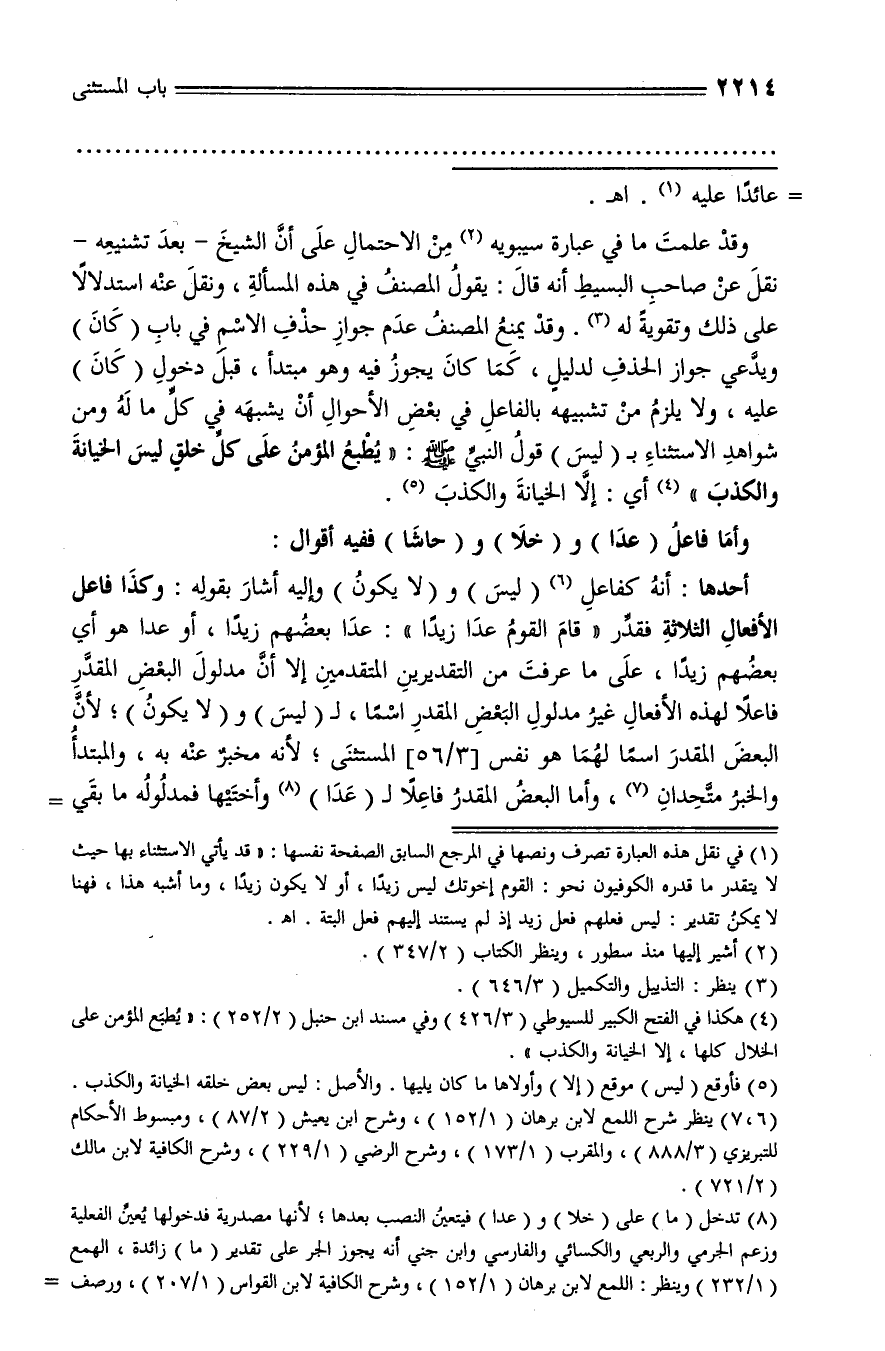 (¬1) في نقل هذه العبارة تصرف ونصها في المرجع السابق الصفحة نفسها: «قد يأتي الاستثناء بها حيث لا يتقدر ما قدره الكوفيون نحو: القوم إخوتك ليس زيدا، أو لا يكون زيدا، وما أشبه هذا، فهنا لا يمكن تقدير: ليس فعلهم فعل زيد إذ لم يستند إليهم فعل البتة. اه.