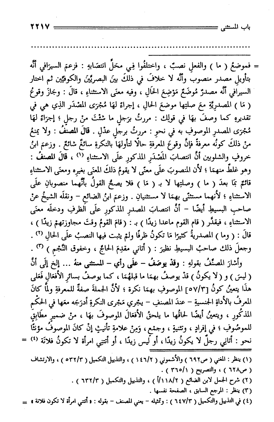 وأشار المصنّف بقوله: وقد يوصف - على رأي - المستثنى منه ... إلخ إلى أنّ (ليس) و (لا يكون) قد يوصف بهما ما قبلهما، كما يوصف بسائر الأفعال فعلى هذا يتعين كون [3/ 57] الموصوف بهما نكرة؛ لأنّ الجملة صفة للمعرفة ولمّا كان المعرف بالأداة الجنسية - عند المصنف - يجري مجرى النكرة أدرجه معها في الحكم المذكور، ويتعين أيضا لحاقها ما يلحق الأفعال الموصوف بها، من ضمير مطابق للموصوف؛ في إفراد، وتثنية، وجمع، ومن علامة تأنيث إن كان الموصوف مؤنثا نحو: أتاني رجل لا يكون زيدا، أو ليس زيدا، أو أتتني امرأة لا تكون فلانة (¬4) -