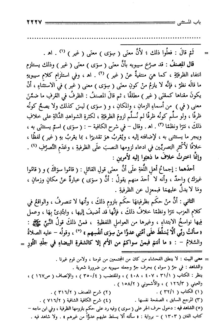 قال المصنف: قد صرّح سيبويه بأنّ معنى (سوى) معنى (غير) وذلك يستلزم انتفاء الظرفيّة، كما هي منتفية عن (غير) (¬2). اه، وفي استلزام كلام سيبويه ما قاله نظر، فإنّه لا يلزم من كون معنى (سوى) معنى (غير) في الاستثناء، أن يكون معناها كمعنى (غير) مطلقا، ثم قال المصنف: الظرف في العرف ما ضمّن معنى (في) من أسماء الزمان، والمكان، و (سوى) ليس كذلك ولا يصحّ كونه ظرفا، ولو سلّم كونه ظرفا لم نسلّم لزوم الظرفيّة، لكثرة الشواهد الدّالة على خلاف ذلك، نثرا ونظما (¬3). اه. وقال - في شرح الكافية -: (سوى) اسم يستثنى به، ويجر ما يستثنى به، لإضافته إليه، ويعرب هو تقديرا، بما يعرب به (غير) لفظا، خلافا لأكثر البصريّين في ادعاء لزومها النصب على الظرفية، وعدم التّصرّف (¬4).
