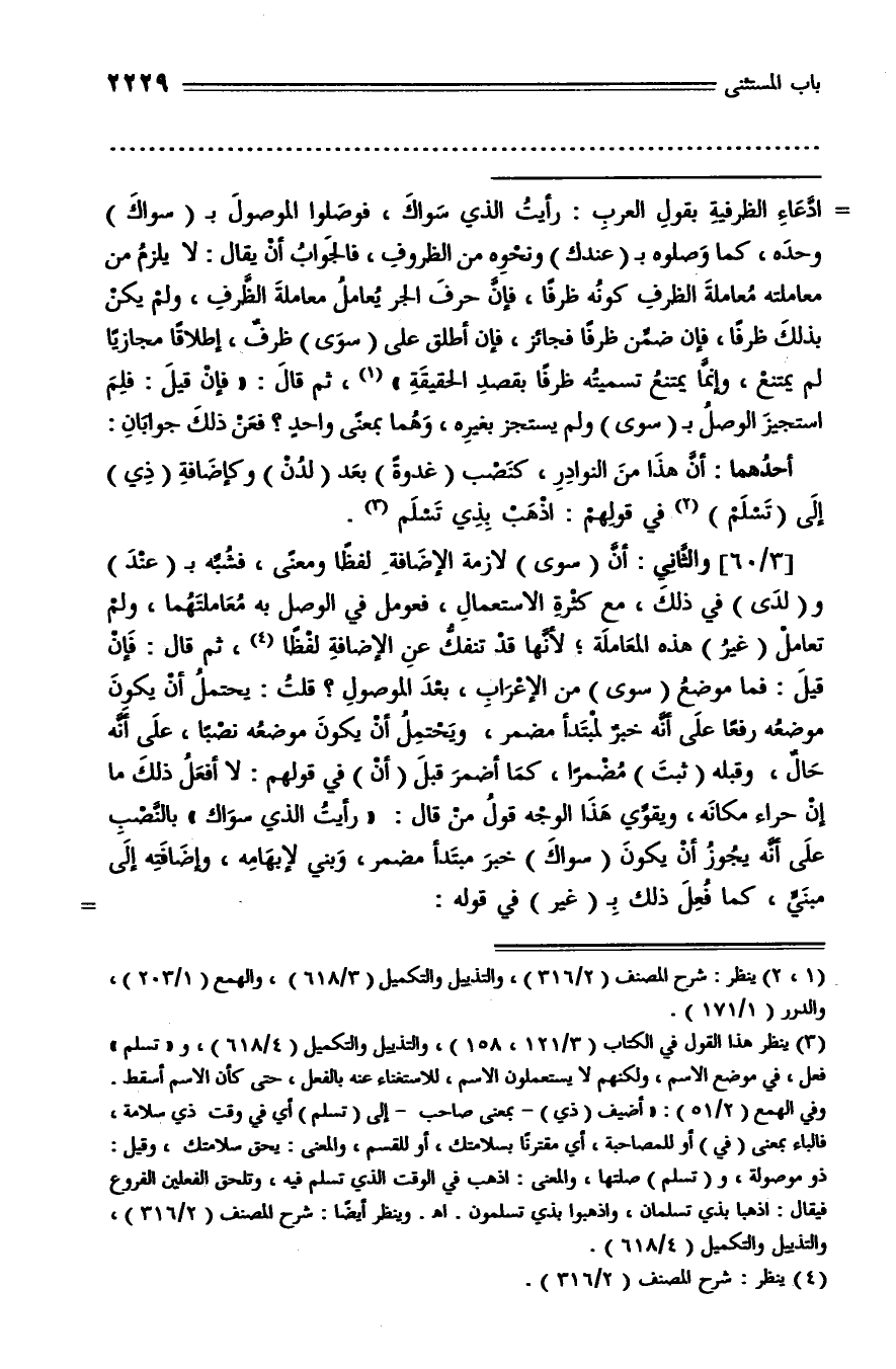 [3/ 60] والثّاني: أنّ (سوى) لازمة الإضافة لفظا ومعنى، فشبّه بـ (عند) و (لدى) في ذلك، مع كثرة الاستعمال، فعومل في الوصل به معاملتهما، ولم تعامل (غير) هذه المعاملة؛ لأنّها قد تنفكّ عن الإضافة لفظا (¬4)، ثم قال: فإن قيل: فما موضع (سوى) من الإعراب، بعد الموصول؟ قلت: يحتمل أن يكون موضعه رفعا على أنّه خبر لمبتدأ مضمر، ويحتمل أن يكون موضعه نصبا، على أنّه حال، وقبله (ثبت) مضمرا، كما أضمر قبل (أن) في قولهم: لا أفعل ذلك ما إن حراء مكانه، ويقوّي هذا الوجه قول من قال: «رأيت الذي سواك» بالنّصب على أنّه يجوز أن يكون (سواك) خبر مبتدأ مضمر، وبني لإبهامه، وإضافته إلى مبنيّ، كما فعل ذلك بـ (غير) في قوله: -
