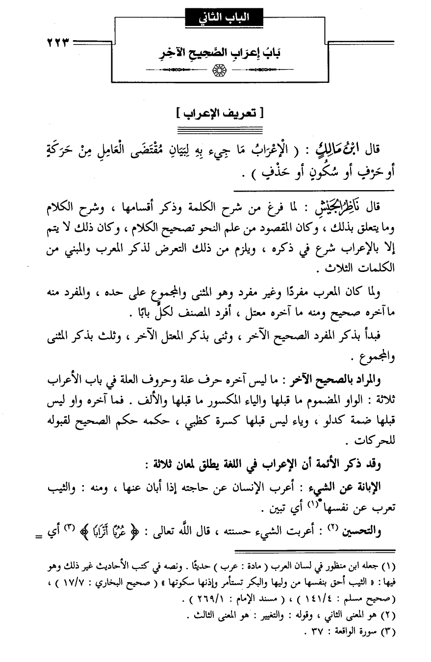 قال ابن مالك: (الإعراب ما جيء به لبيان مقتضى العامل من حركة أو حرف أو سكون أو حذف).
