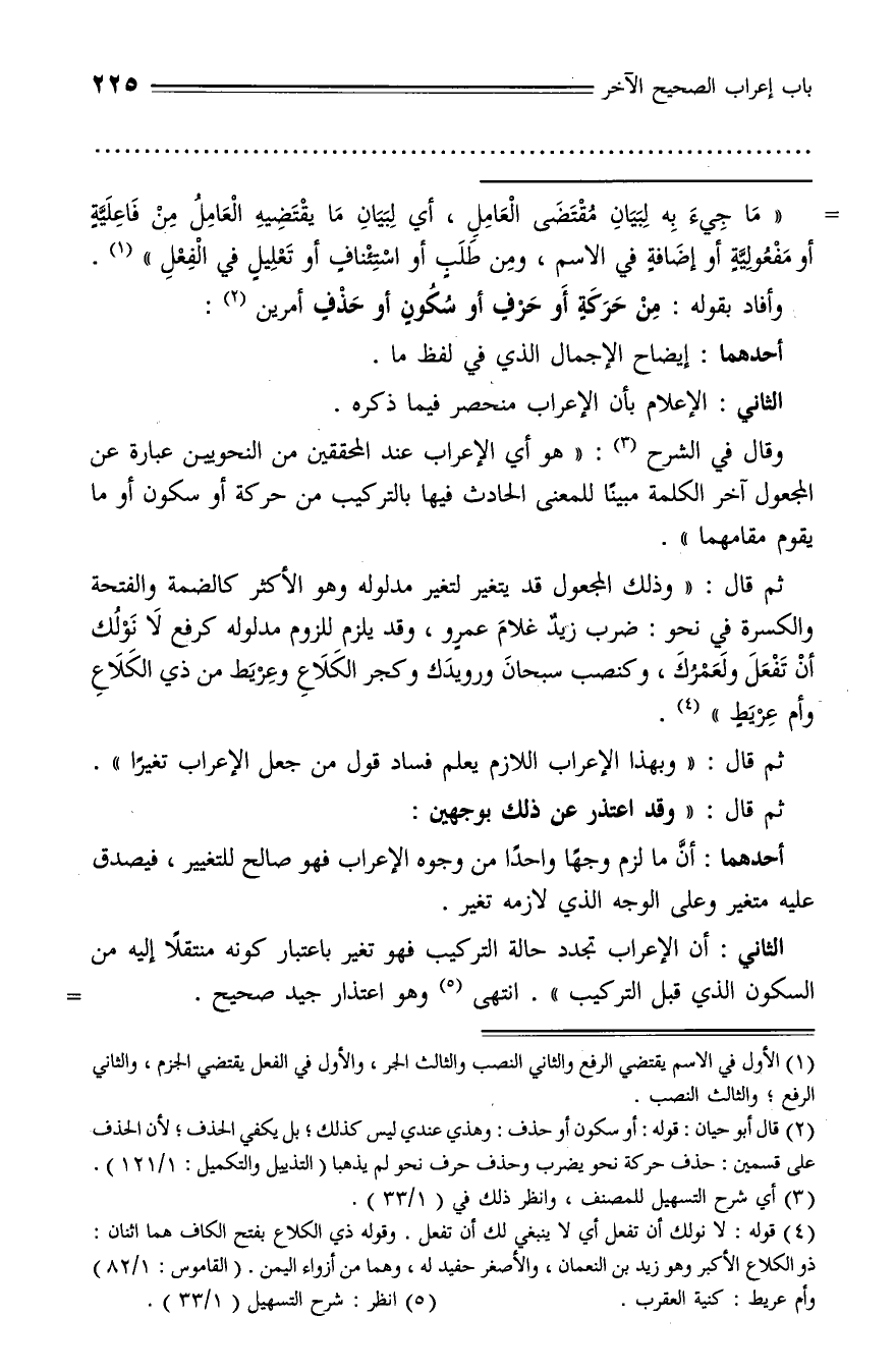الثاني: أن الإعراب تجدد حالة التركيب فهو تغير باعتبار كونه منتقلا إليه من السكون الذي قبل التركيب». انتهى (¬5) وهو اعتذار جيد صحيح. -