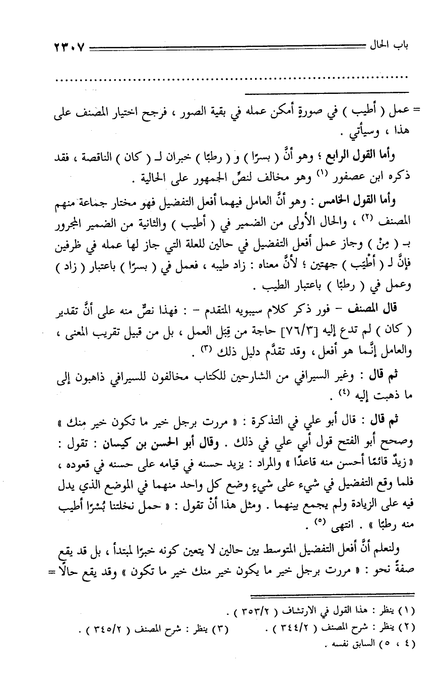 وأما القول الخامس: وهو أنّ العامل فيهما أفعل التفضيل فهو مختار جماعة منهم المصنف (¬2)، والحال الأولى من الضمير في (أطيب) والثانية من الضمير المجرور بـ (من) وجاز عمل أفعل التفضيل في حالين للعلة التي جاز لها عمله في ظرفين فإنّ لـ (أطيب) جهتين؛ لأنّ معناه: زاد طيبه، فعمل في (بسرا) باعتبار (زاد) وعمل في (رطبا) باعتبار الطيب.