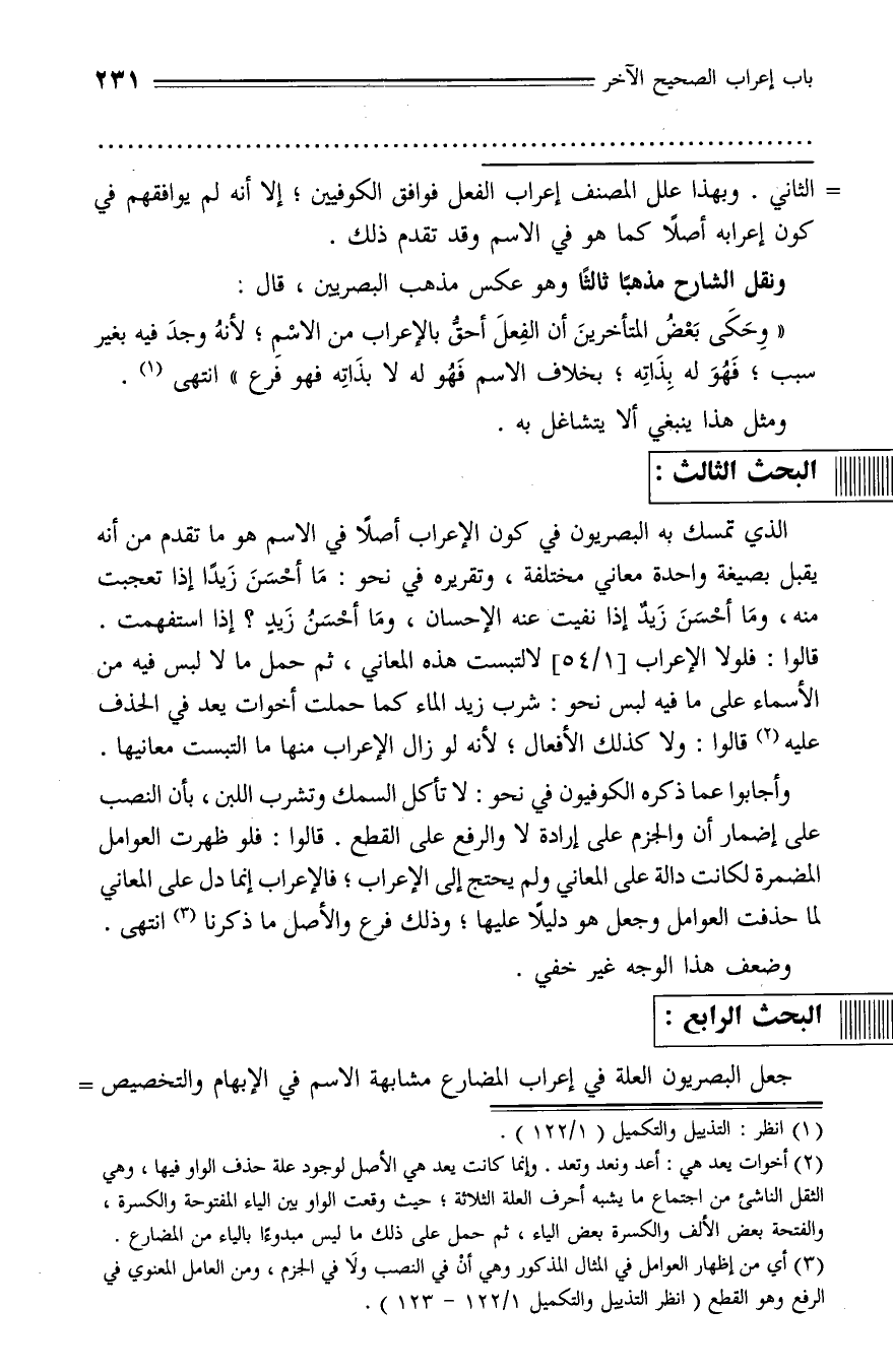 الذي تمسك به البصريون في كون الإعراب أصلا في الاسم هو ما تقدم من أنه يقبل بصيغة واحدة معاني مختلفة، وتقريره في نحو: ما أحسن زيدا إذا تعجبت منه، وما أحسن زيد إذا نفيت عنه الإحسان، وما أحسن زيد؟ إذا استفهمت.