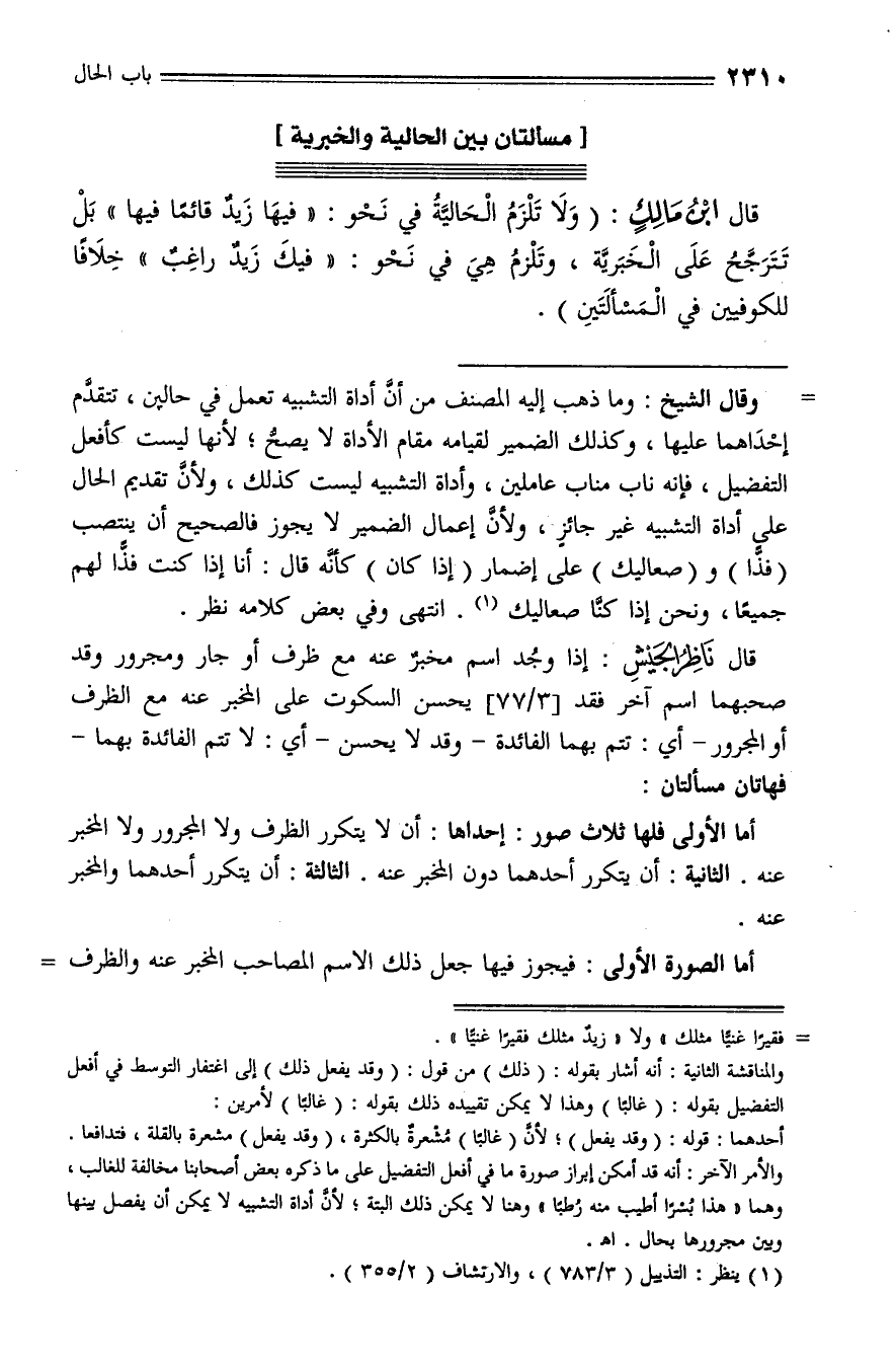 قال ناظر الجيش: إذا وجد اسم مخبر عنه مع ظرف أو جار ومجرور وقد صحبهما اسم آخر فقد [3/ 77] يحسن السكوت على المخبر عنه مع الظرف أو المجرور - أي: تتم بهما الفائدة - وقد لا يحسن - أي: لا تتم الفائدة بهما - فهاتان مسألتان: