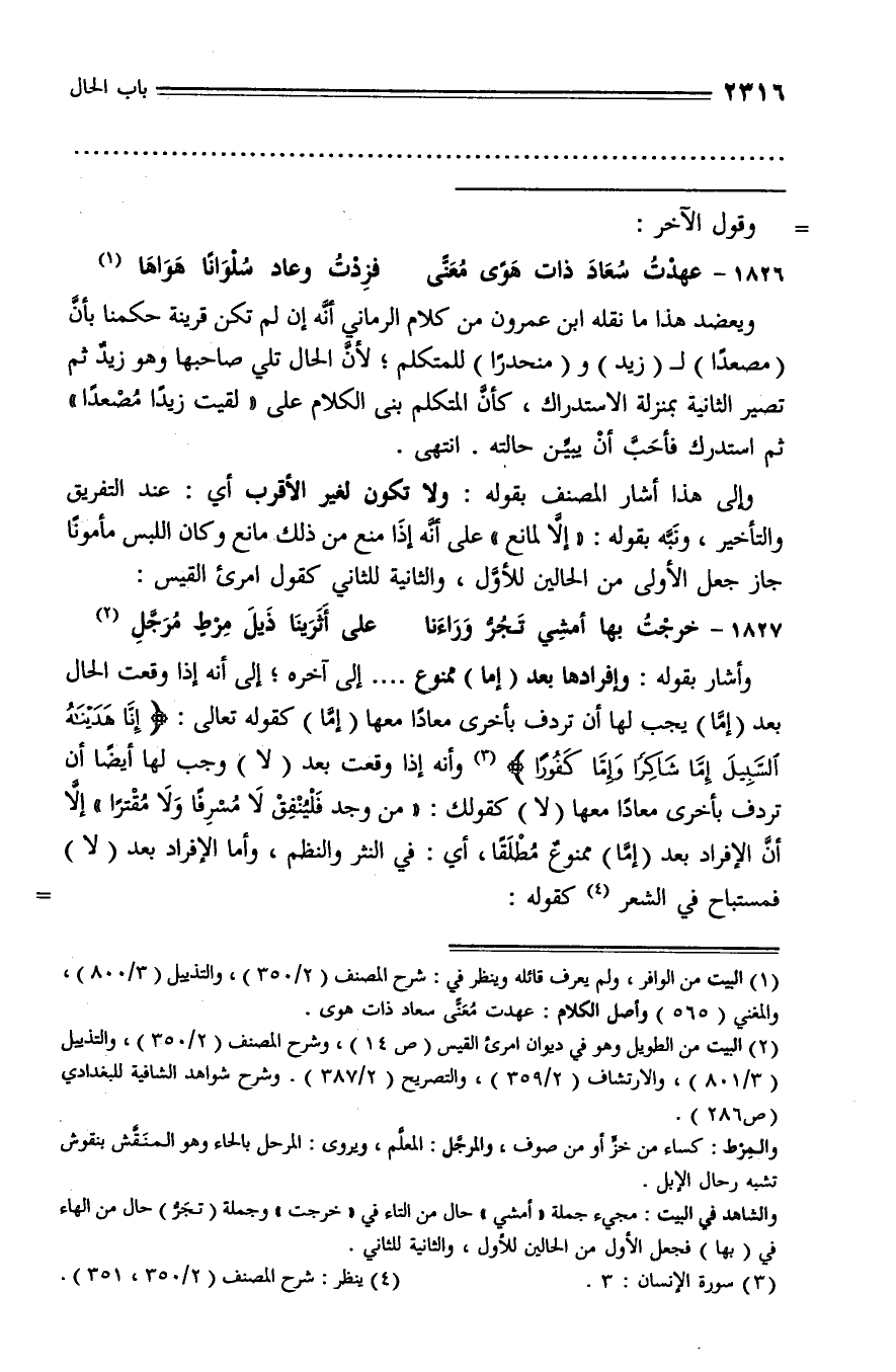 وأشار بقوله: وإفرادها بعد (إما) ممنوع ... إلى آخره؛ إلى أنه إذا وقعت الحال بعد (إمّا) يجب لها أن تردف بأخرى معادا معها (إمّا) كقوله تعالى: إِنَّا هَدَيْناهُ السَّبِيلَ إِمَّا شاكِراً وَإِمَّا كَفُوراً (¬3) وأنه إذا وقعت بعد (لا) وجب لها أيضا أن تردف بأخرى معادا معها (لا) كقولك: «من وجد فلينفق لا مسرفا ولا مقترا» إلّا أنّ الإفراد بعد (إمّا) ممنوع مطلقا، أي: في النثر والنظم، وأما الإفراد بعد (لا) فمستباح في الشعر (¬4) كقوله: -