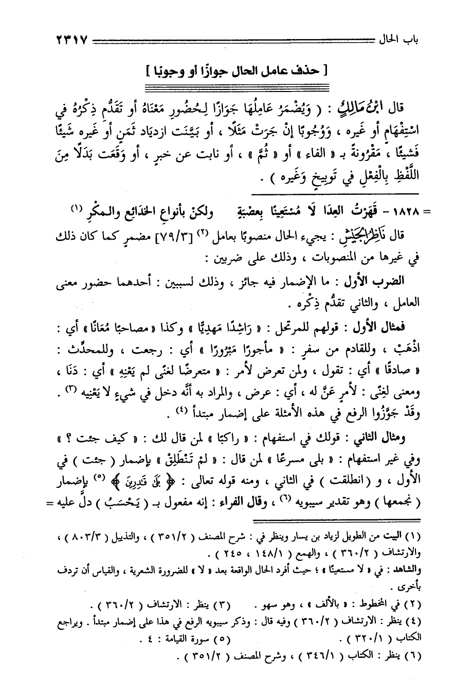قال ناظر الجيش: يجيء الحال منصوبا بعامل (¬2) [3/ 79] مضمر كما كان ذلك في غيرها من المنصوبات، وذلك على ضربين: