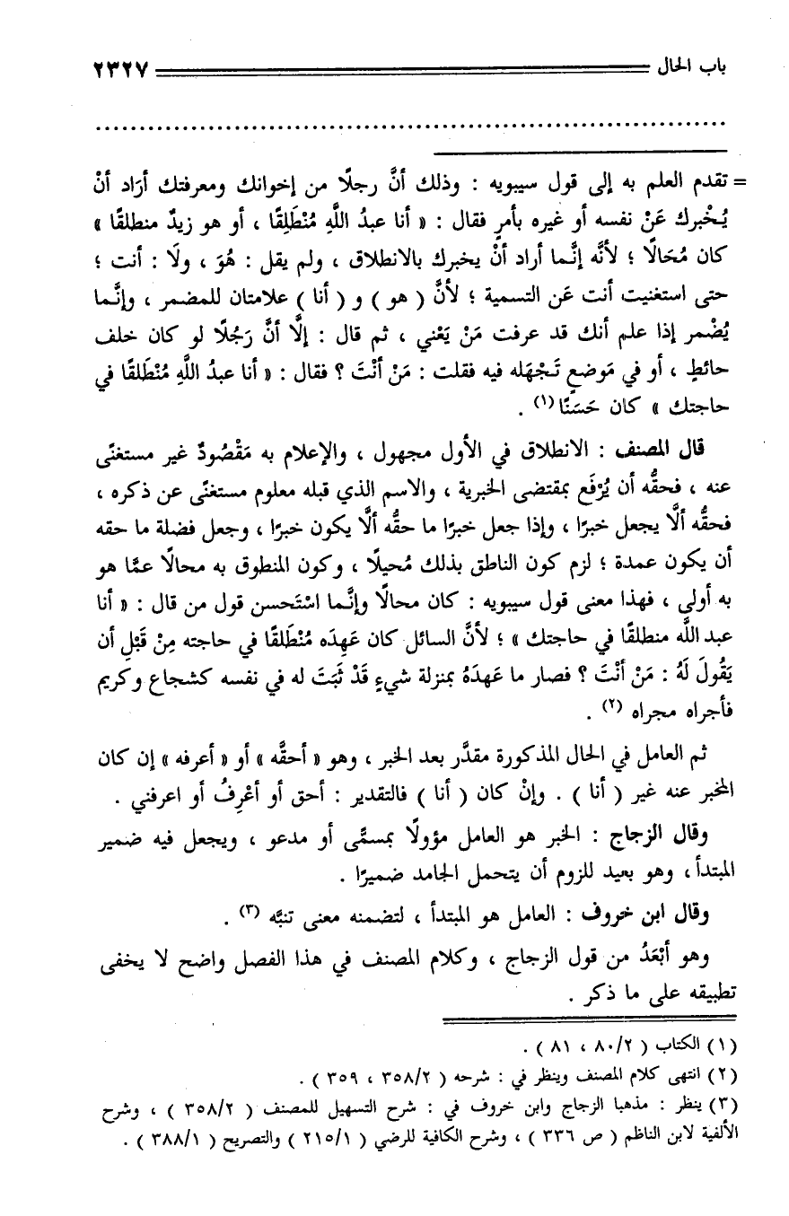 (¬3) ينظر: مذهبا الزجاج وابن خروف في: شرح التسهيل للمصنف (2/ 358)، وشرح الألفية لابن الناظم (ص 336)، وشرح الكافية للرضي (1/ 215) والتصريح (1/ 388).