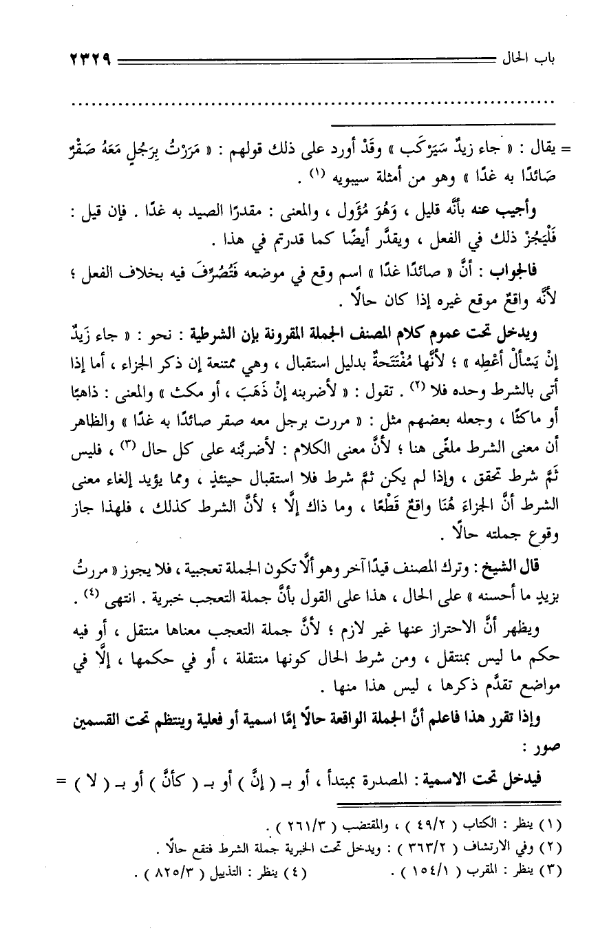 ويدخل تحت عموم كلام المصنف الجملة المقرونة بإن الشرطية: نحو: «جاء زيد إن يسأل أعطه»؛ لأنّها مفتتحة بدليل استقبال، وهي ممتنعة إن ذكر الجزاء، أما إذا أتى بالشرط وحده فلا (¬2). تقول: «لأضربنه إن ذهب، أو مكث» والمعنى: ذاهبا أو ماكثا، وجعله بعضهم مثل: «مررت برجل معه صقر صائدا به غدا» والظاهر أن معنى الشرط ملغى هنا؛ لأنّ معنى الكلام: لأضربّنه على كل حال (¬3)، فليس ثمّ شرط تحقق، وإذا لم يكن ثمّ شرط فلا استقبال حينئذ، ومما يؤيد إلغاء معنى الشرط أنّ الجزاء هنا واقع قطعا، وما ذاك إلّا؛ لأنّ الشرط كذلك، فلهذا جاز وقوع جملته حالا.
