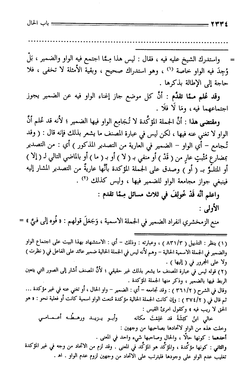 ومقتضى هذا: أنّ الجملة المؤكّدة لا تجامع الواو فيها الضمير؛ لأنه قد علم أنّ الواو لا تغني عنه فيها، لكن ليس في عبارة المصنف ما يشعر بذلك فإنه قال: (وقد تجامع - أي الواو - الضمير في العارية من التصدير المذكور) أي: من التصدير بمضارع مثبت عار من (قد) أو منفي بـ (لا) أو بـ (ما) أو بالماضي التالي لـ (إلا) أو المتلوّ بـ (أو) وصدق على الجملة المؤكدة بأنّها عارية من التصدير المشار إليه فينبغي جواز مجامعة الواو للضمير فيها، وليس كذلك (¬2).