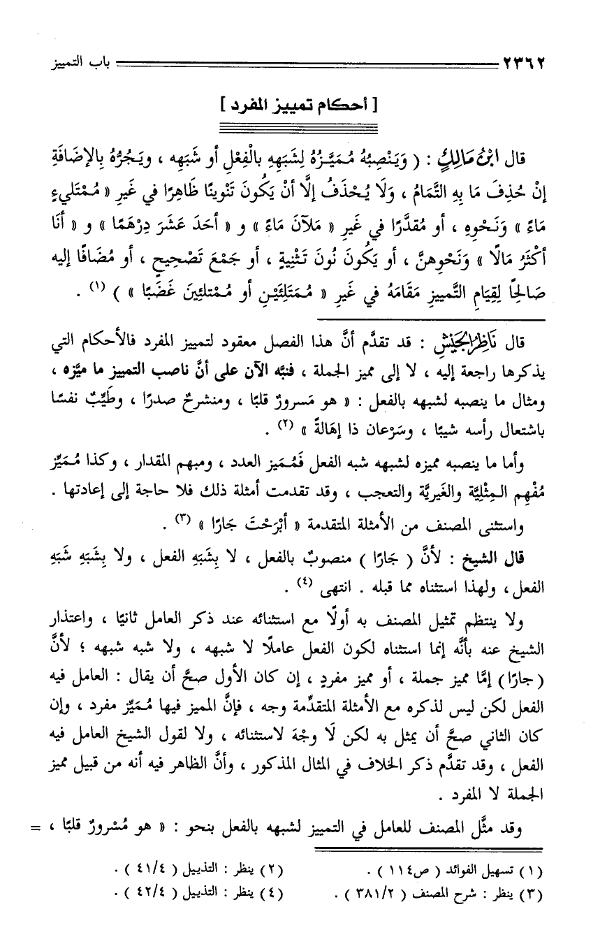 قال ناظر الجيش: قد تقدّم أنّ هذا الفصل معقود لتمييز المفرد فالأحكام التي يذكرها راجعة إليه، لا إلى مميز الجملة، فنبّه الآن على أنّ ناصب التمييز ما ميّزه، ومثال ما ينصبه لشبهه بالفعل: «هو مسرور قلبا، ومنشرح صدرا، وطيّب نفسا باشتعال رأسه شيبا، وسرعان ذا إهالة» (¬2).