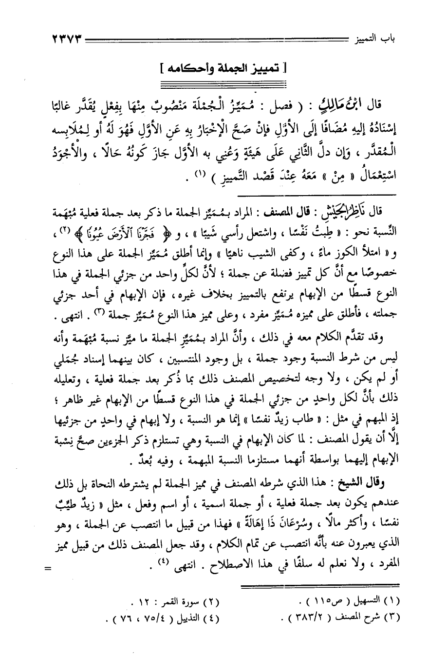 وقال الشيخ: هذا الذي شرطه المصنف في مميز الجملة لم يشترطه النحاة بل ذلك عندهم يكون بعد جملة فعلية، أو جملة اسمية، أو اسم وفعل، مثل «زيد طيّب نفسا، وأكثر مالا، وسرعان ذا إهالة» فهذا من قبيل ما انتصب عن الجملة، وهو الذي يعبرون عنه بأنّه انتصب عن تمام الكلام، وقد جعل المصنف ذلك من قبيل مميز المفرد، ولا نعلم له سلفا في هذا الاصطلاح. انتهى (¬4). -