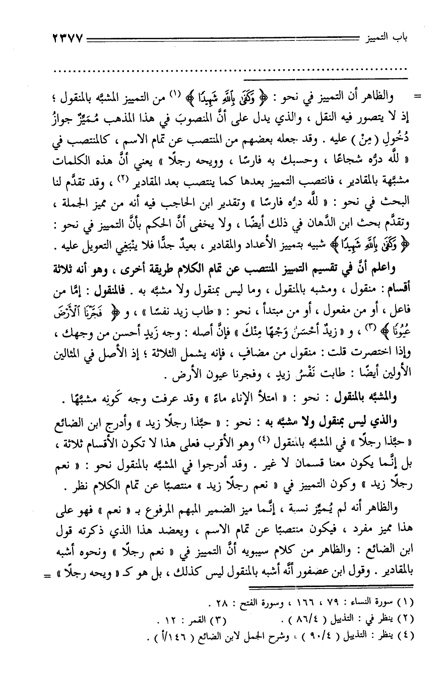 والظاهر أن التمييز في نحو: وَكَفى بِاللَّهِ شَهِيداً * (¬1) من التمييز المشبّه بالمنقول؛ إذ لا يتصور فيه النقل، والذي يدل على أنّ المنصوب في هذا المذهب مميّز جواز دخول (من) عليه. وقد جعله بعضهم من المنتصب عن تمام الاسم، كالمنتصب في «لله درّه شجاعا، وحسبك به فارسا، وويحه رجلا» يعني أنّ هذه الكلمات مشبّهة بالمقادير، فانتصب التمييز بعدها كما ينتصب بعد المقادير (¬2)، وقد تقدّم لنا البحث في نحو: «لله درّه فارسا» وتقدير ابن الحاجب فيه أنه من مميز الجملة، وتقدّم بحث ابن الدّهان في ذلك أيضا، ولا يخفى أنّ الحكم بأنّ التمييز في نحو: