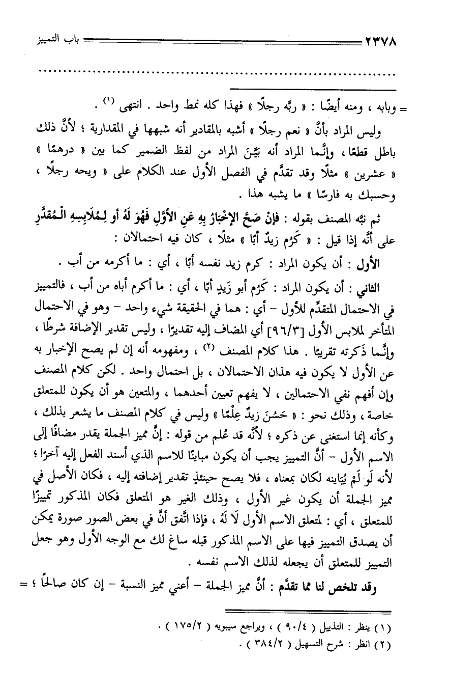 ثم نبّه المصنف بقوله: فإن صحّ الإخبار به عن الأوّل فهو له أو لملابسه المقدّر على أنّه إذا قيل: «كرم زيد أبا» مثلا، كان فيه احتمالان: