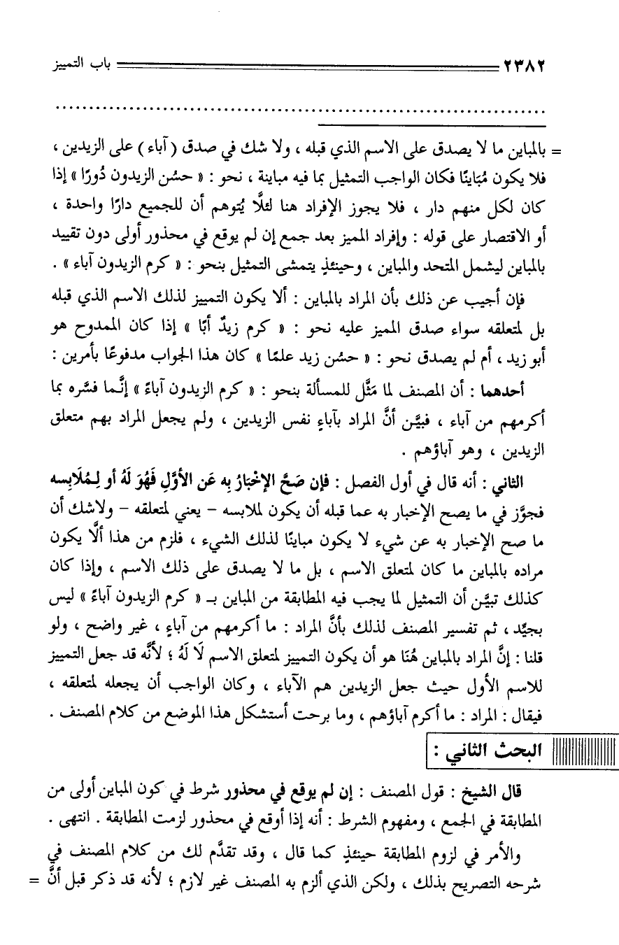 الثاني: أنه قال في أول الفصل: فإن صحّ الإخبار به عن الأوّل فهو له أو لملابسه فجوّز في ما يصح الإخبار به عما قبله أن يكون لملابسه - يعني لمتعلقه - ولا شك أن ما صح الإخبار به عن شيء لا يكون مباينا لذلك الشيء، فلزم من هذا ألّا يكون مراده بالمباين ما كان لمتعلق الاسم، بل ما لا يصدق على ذلك الاسم، وإذا كان كذلك تبيّن أن التمثيل لما يجب فيه المطابقة من المباين بـ «كرم الزيدون آباء» ليس بجيّد، ثم تفسير المصنف لذلك بأنّ المراد: ما أكرمهم من آباء، غير واضح، ولو قلنا: إنّ المراد بالمباين هنا هو أن يكون التمييز لمتعلق الاسم لا له؛ لأنّه قد جعل التمييز للاسم الأول حيث جعل الزيدين هم الآباء، وكان الواجب أن يجعله لمتعلقه، فيقال: المراد: ما أكرم آباؤهم، وما برحت أستشكل هذا الموضع من كلام المصنف.