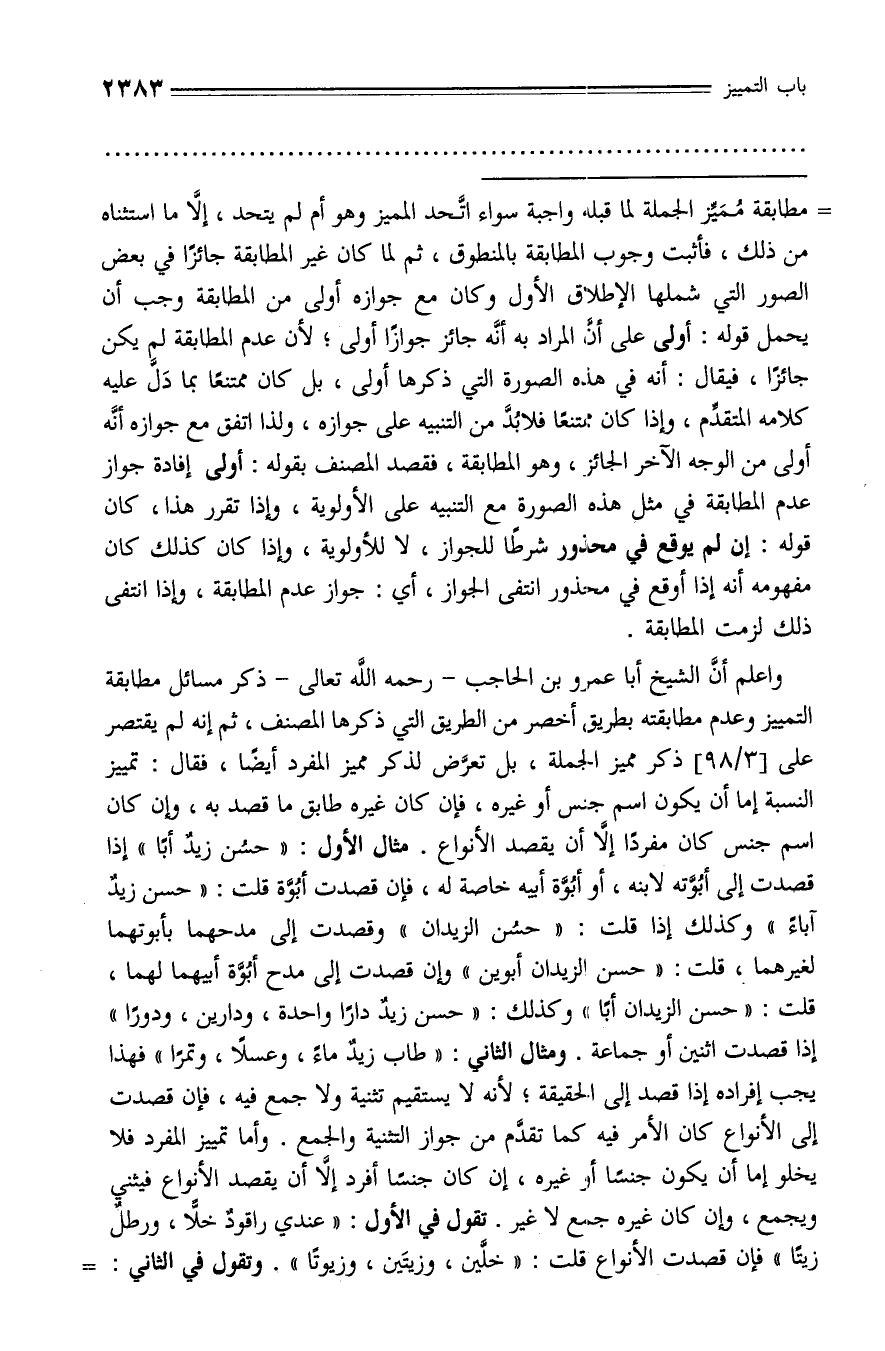 واعلم أنّ الشيخ أبا عمرو بن الحاجب - رحمه الله تعالى - ذكر مسائل مطابقة التمييز وعدم مطابقته بطريق أخصر من الطريق التي ذكرها المصنف، ثم إنه لم يقتصر على [3/ 98] ذكر مميز الجملة، بل تعرّض لذكر مميز المفرد أيضا، فقال: تمييز النسبة إما أن يكون اسم جنس أو غيره، فإن كان غيره طابق ما قصد به، وإن كان اسم جنس كان مفردا إلّا أن يقصد الأنواع. مثال الأول: «حسن زيد أبا» إذا قصدت إلى أبوّته لابنه، أو أبوّة أبيه خاصة له، فإن قصدت أبوّة قلت: «حسن زيد آباء» وكذلك إذا قلت: «حسن الزيدان» وقصدت إلى مدحهما بأبوتهما لغيرهما، قلت: «حسن الزيدان أبوين» وإن قصدت إلى مدح أبوّة أبيهما لهما، قلت: «حسن الزيدان أبا» وكذلك: «حسن زيد دارا واحدة، ودارين، ودورا» إذا قصدت اثنين أو جماعة. ومثال الثاني: «طاب زيد ماء، وعسلا، وتمرا» فهذا يجب إفراده إذا قصد إلى الحقيقة؛ لأنه لا يستقيم تثنية ولا جمع فيه، فإن قصدت إلى الأنواع كان الأمر فيه كما تقدّم من جواز التثنية والجمع. وأما تمييز المفرد فلا يخلو إما أن يكون جنسا أو غيره، إن كان جنسا أفرد إلّا أن يقصد الأنواع فيثني ويجمع، وإن كان غيره جمع لا غير. تقول في الأول: «عندي راقود خلّا، ورطل زيتا» فإن قصدت الأنواع قلت: «خلّين، وزيتين، وزيوتا». وتقول في الثاني: -