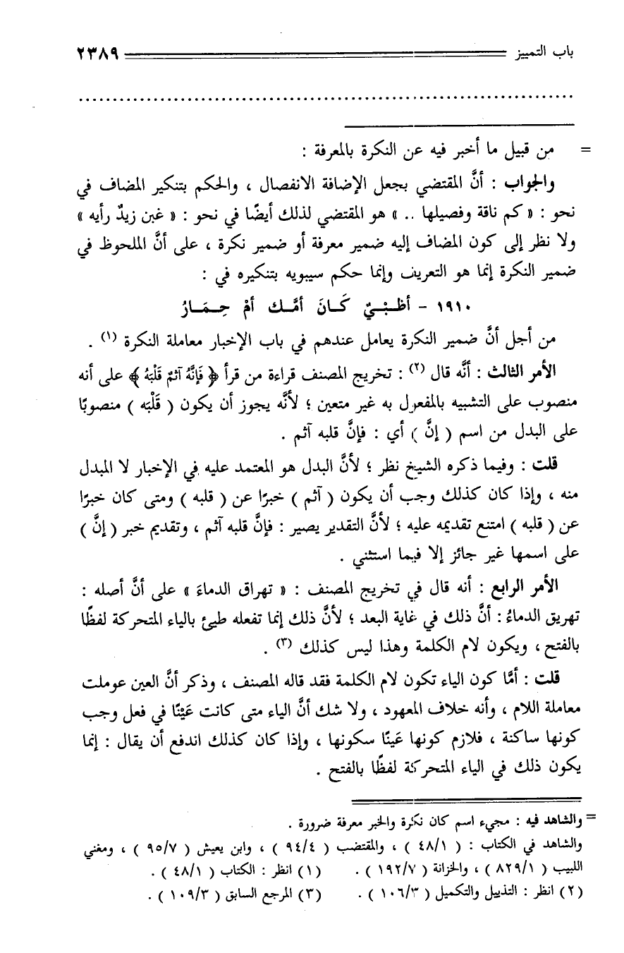 والجواب: أنّ المقتضي بجعل الإضافة الانفصال، والحكم بتنكير المضاف في نحو: «كم ناقة وفصيلها ...» هو المقتضي لذلك أيضا في نحو: «غبن زيد رأيه» ولا نظر إلى كون المضاف إليه ضمير معرفة أو ضمير نكرة، على أنّ الملحوظ في ضمير النكرة إنما هو التعريف وإنما حكم سيبويه بتنكيره في: