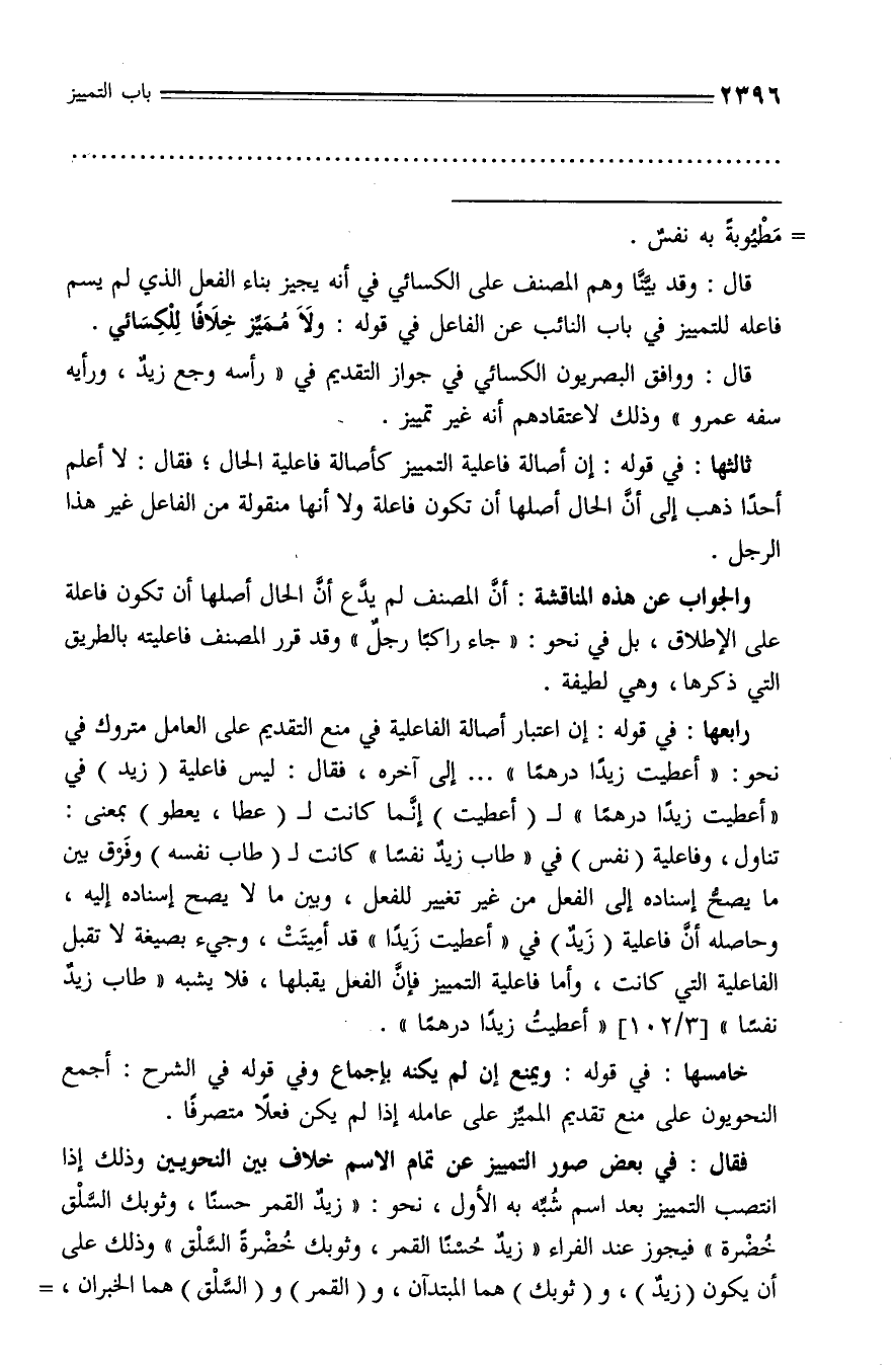 تناول، وفاعلية (نفس) في «طاب زيد نفسا» كانت لـ (طاب نفسه) وفرق بين ما يصحّ إسناده إلى الفعل من غير تغيير للفعل، وبين ما لا يصح إسناده إليه، وحاصله أنّ فاعلية (زيد) في «أعطيت زيدا» قد أميتت، وجيء بصيغة لا تقبل الفاعلية التي كانت، وأما فاعلية التمييز فإنّ الفعل يقبلها، فلا يشبه «طاب زيد نفسا» [3/ 102] «أعطيت زيدا درهما».