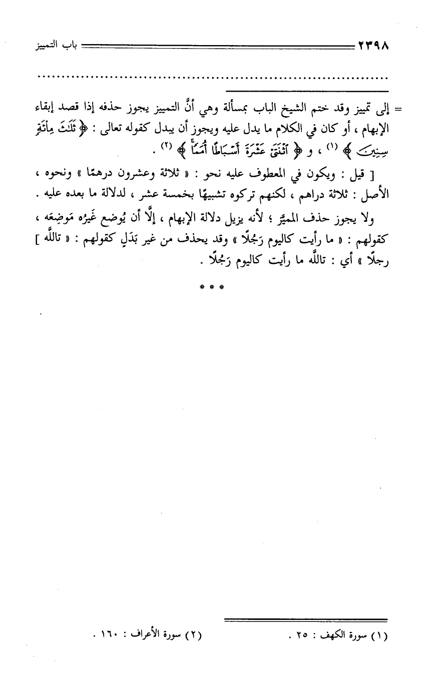 إلى تمييز وقد ختم الشيخ الباب بمسألة وهي أنّ التمييز يجوز حذفه إذا قصد إبقاء الإبهام، أو كان في الكلام ما