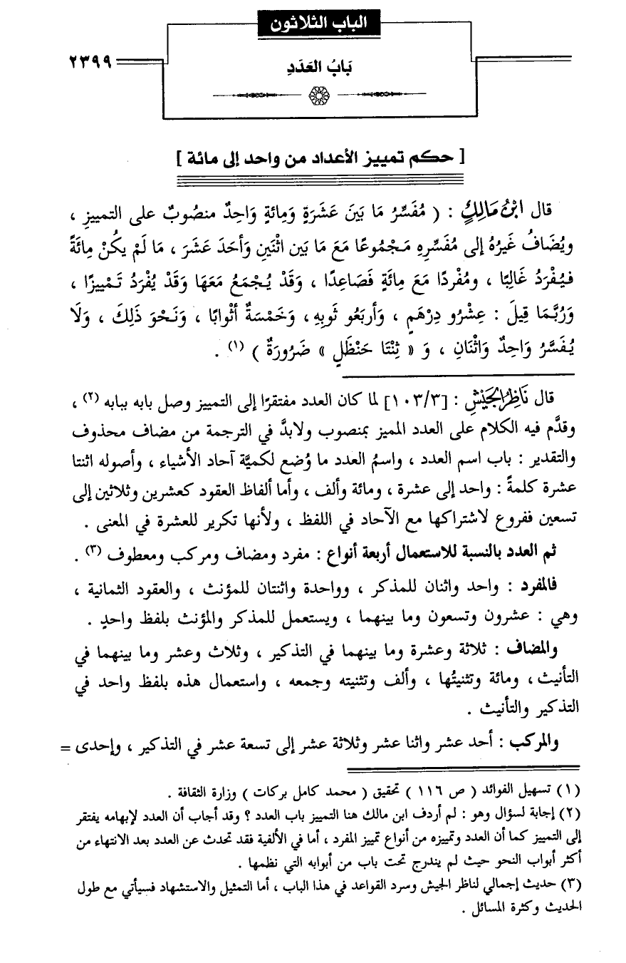(¬2) إجابة لسؤال وهو: لم أردف ابن مالك هنا التمييز باب العدد؟ وقد أجاب أن العدد لإبهامه يفتقر إلى التمييز كما أن العدد وتمييزه من أنواع تمييز المفرد، أما في الألفية فقد تحدث عن العدد بعد الانتهاء من أكثر أبواب النحو حيث لم يندرج تحت باب من أبوابه التي نظمها.