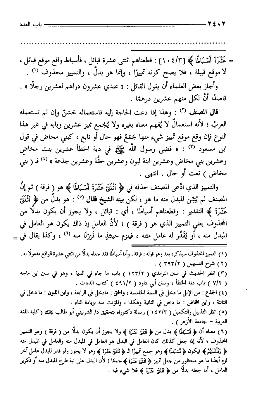 والتمييز الذي ادّعى المصنف حذفه في اثْنَتَيْ عَشْرَةَ أَسْباطاً هو (فرقة) ثم إنّ المصنف لم يبيّن المبدل منه ما هو، لكن بينه الشيخ فقال (¬5): هو بدل من اثْنَتَيْ عَشْرَةَ التقدير: وقطعناهم أسباطا، أي: قبائل، ولا يجوز أن يكون بدلا من المحذوف يعني التمييز الذي هو (فرقة)؛ لأنّ العامل إذ ذاك يكون هو العامل في المبدل منه، أو يقدّر له عامل مثله، فيلزم حينئذ ما فررنا منه (¬6)، وكذا يقال في -