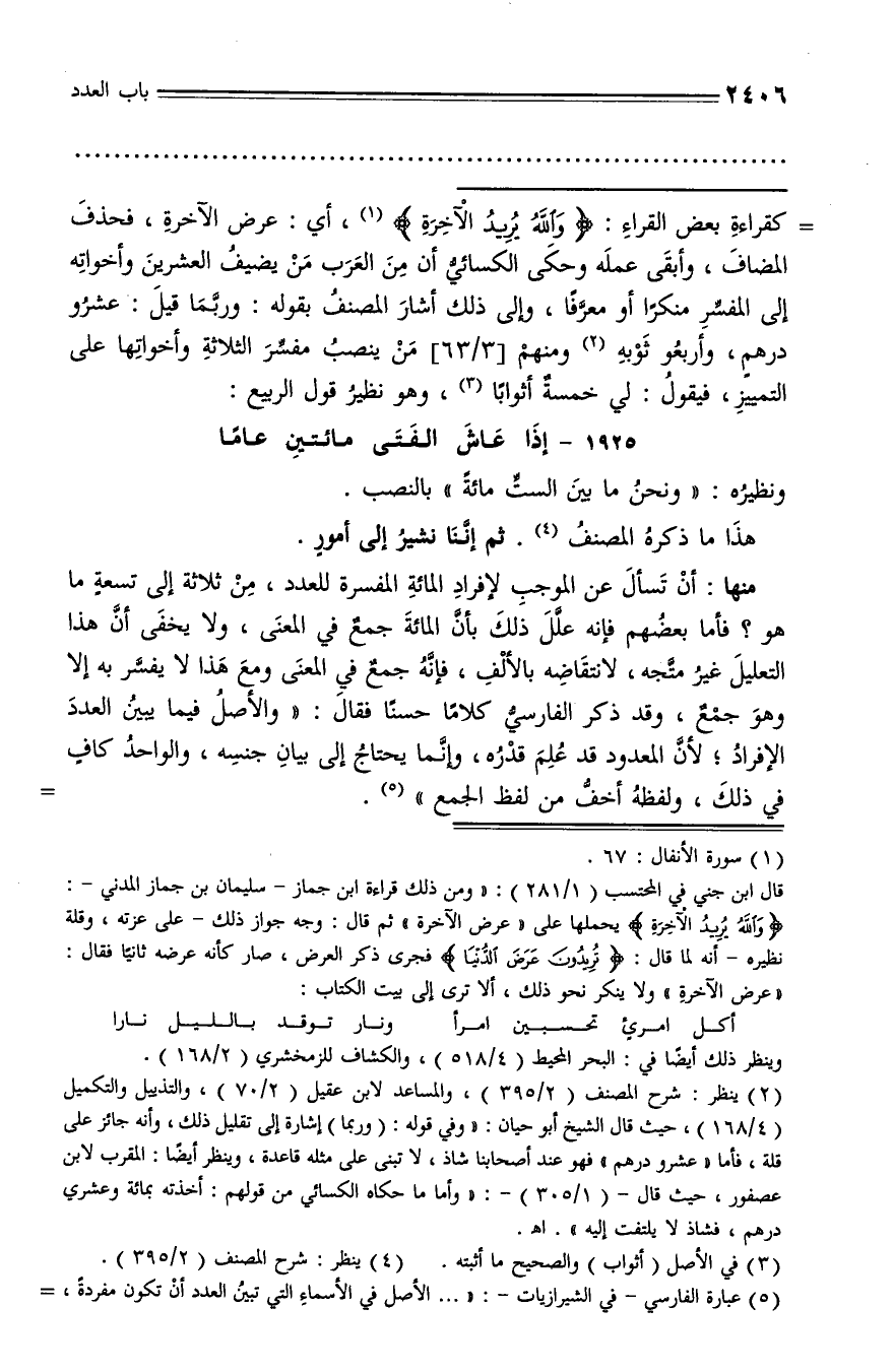 (¬5) عبارة الفارسي - في الشيرازيات -: «... الأصل في الأسماء التي تبين العدد أن تكون مفردة، -