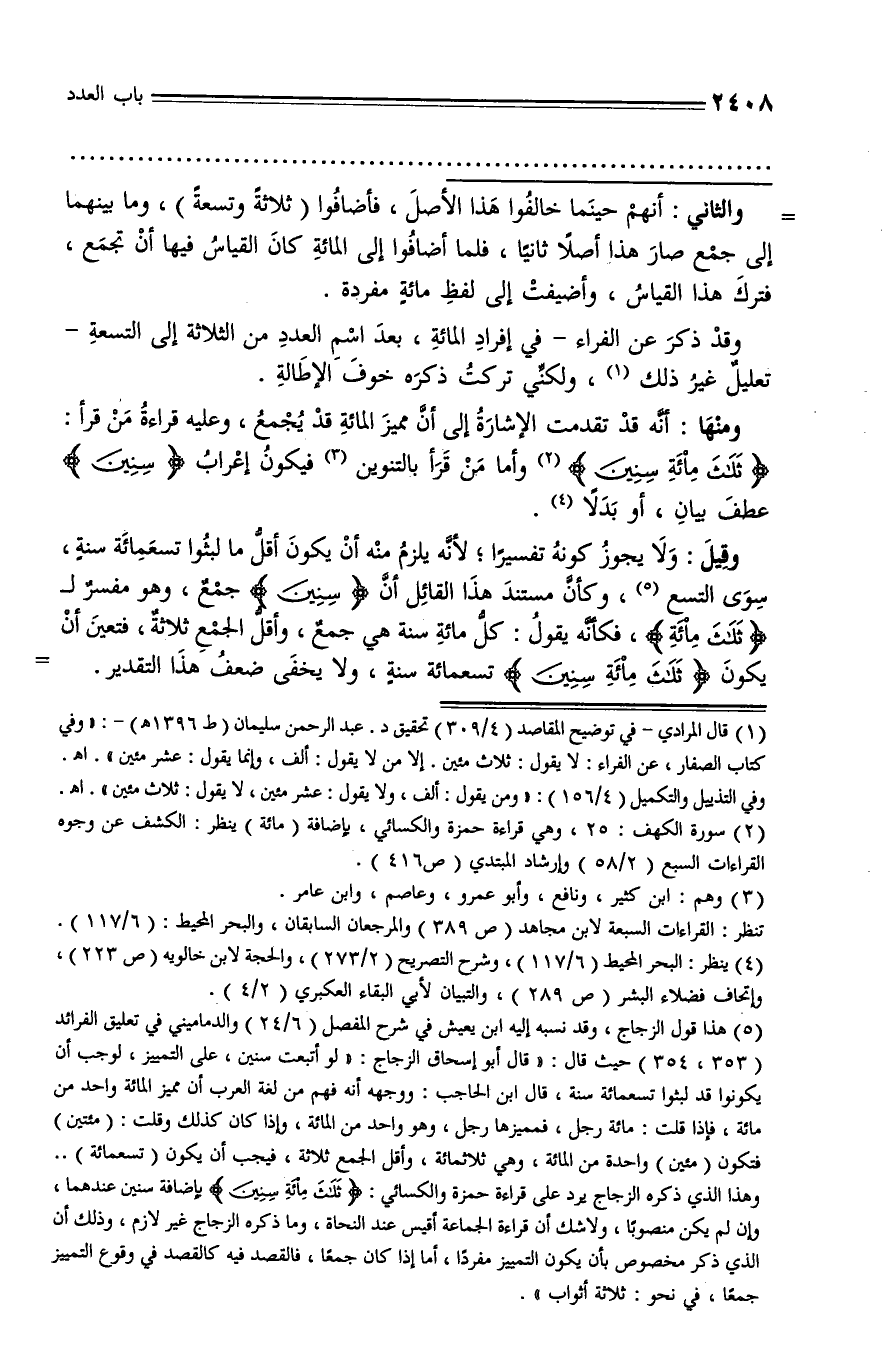 (¬1) قال المرادي - في توضيح المقاصد (4/ 309) تحقيق د. عبد الرحمن سليمان (ط 1396 هـ) -: «وفي كتاب الصفار، عن الفراء: لا يقول: ثلاث مئين. إلا من لا يقول: ألف، وإنما يقول: عشر مئين». اه.