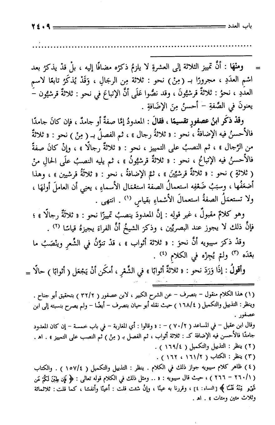 وهو كلام مقبول، غير قوله: إنّ المعدود ينصب تمييزا نحو: «ثلاثة رجالا»؛ فإنّ ذلك لا يجوز عند البصريّين، وذكر الشيخ أنّ الفراء يجيزه قياسا (¬2).
