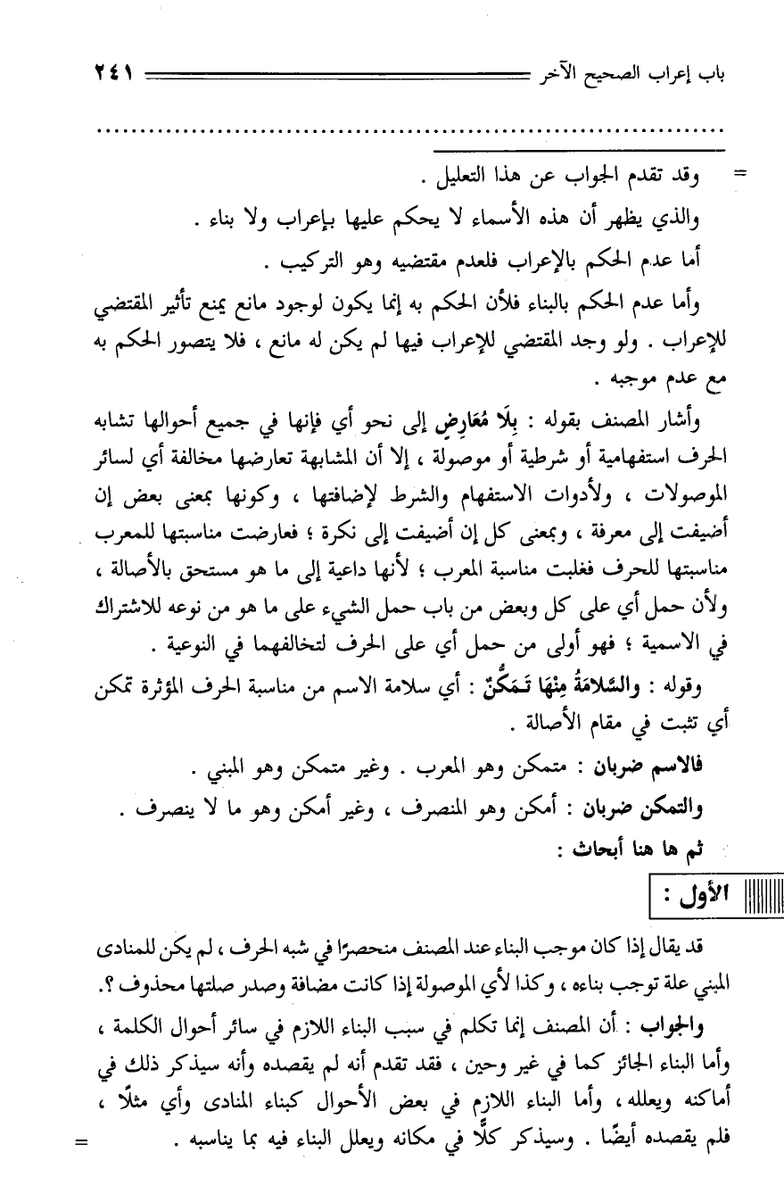 والجواب: أن المصنف إنما تكلم في سبب البناء اللازم في سائر أحوال الكلمة، وأما البناء الجائز كما في غير