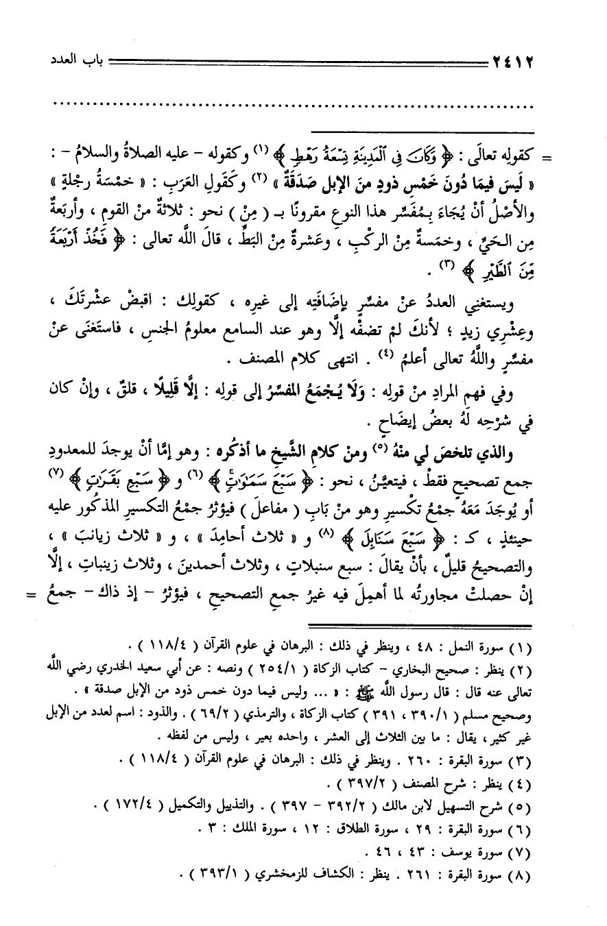 «ليس فيما دون خمس ذود من الإبل صدقة» (¬2) وكقول العرب: «خمسة رجلة» والأصل أن يجاء بمفسّر هذا النوع مقرونا بـ (من) نحو: ثلاثة من القوم، وأربعة من الحيّ، وخمسة من الركب، وعشرة من البطّ، قال الله تعالى: فَخُذْ أَرْبَعَةً مِنَ الطَّيْرِ (¬3).