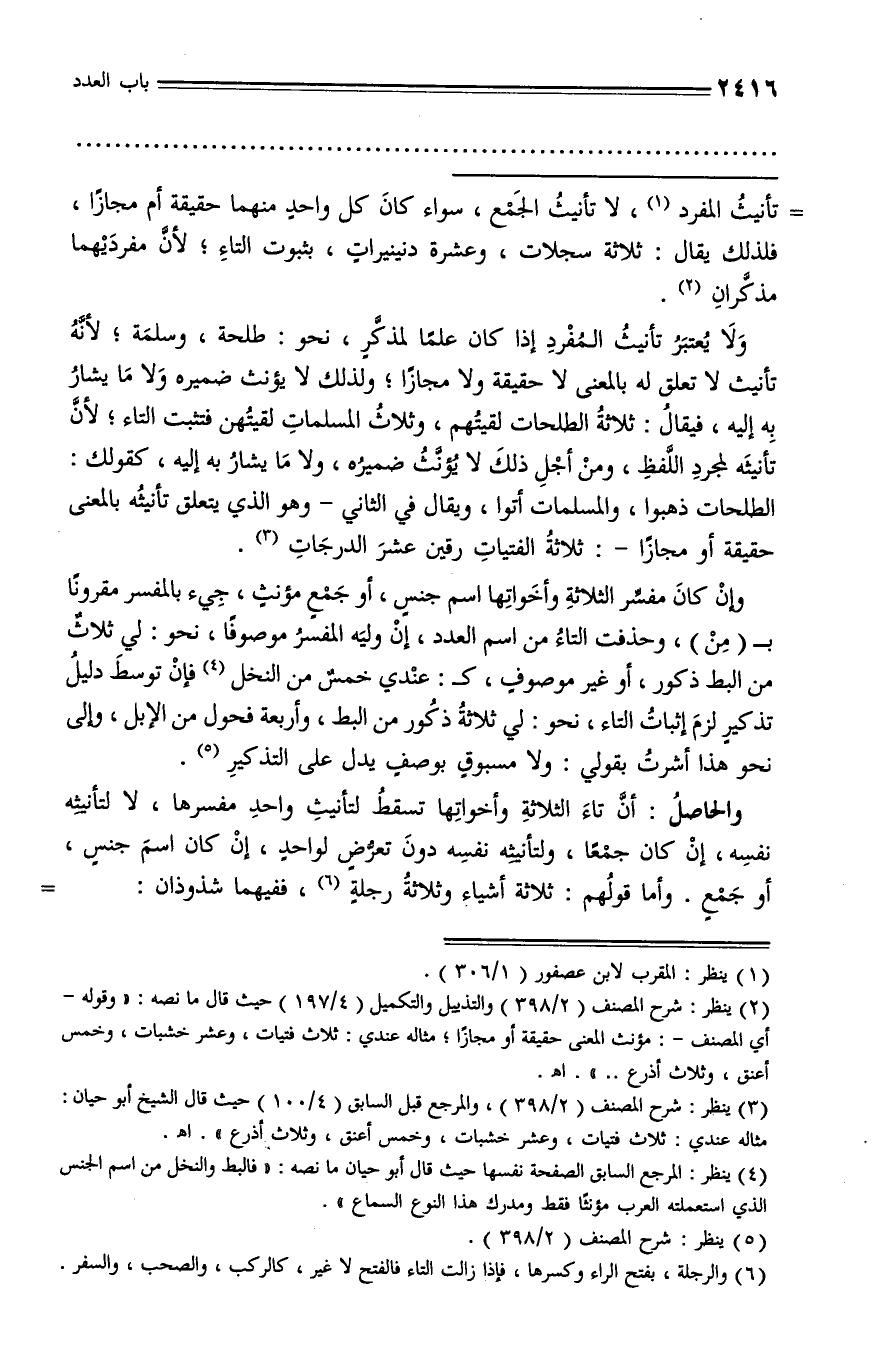 (¬2) ينظر: شرح المصنف (2/ 398) والتذييل والتكميل (4/ 197) حيث قال ما نصه: «وقوله - أي المصنف -: مؤنث المعنى حقيقة أو مجازا؛ مثاله عندي: ثلاث فتيات، وعشر خشبات، وخمس أعنق، وثلاث أذرع ...». اه.