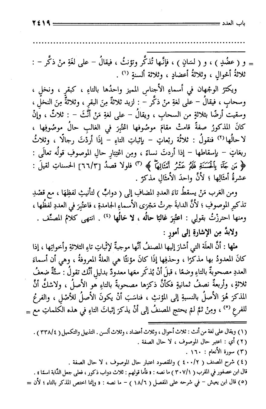 منها: أنّ العلة التي أشار إليها المصنف أنّها موجبة لإثبات تاء الثلاثة وأخواتها، إذا كان المعدود بها مذكرا، وحذفها إذا كان مؤنثا هي العلة المعروفة، وهي أن أسماء العدد مصحوبة بالتاء وضعا، قبل أن يذكر معها معدود بدليل أنّك تقول: ستّة ضعف ثلاثة، وأربعة نصف ثمانية فكأنّ ذكرها مصحوبة بالتاء هو الأصل، ولا شكّ أنّ المذكر هو الأصل بالنسبة إلى المؤنث، فناسب أن يكون الأصل للأصل، والفرع للفرع (¬5)، ومن ثمّ لم يحتج المصنف إلى أن يذكر إثبات التاء في هذه الكلمات مع -