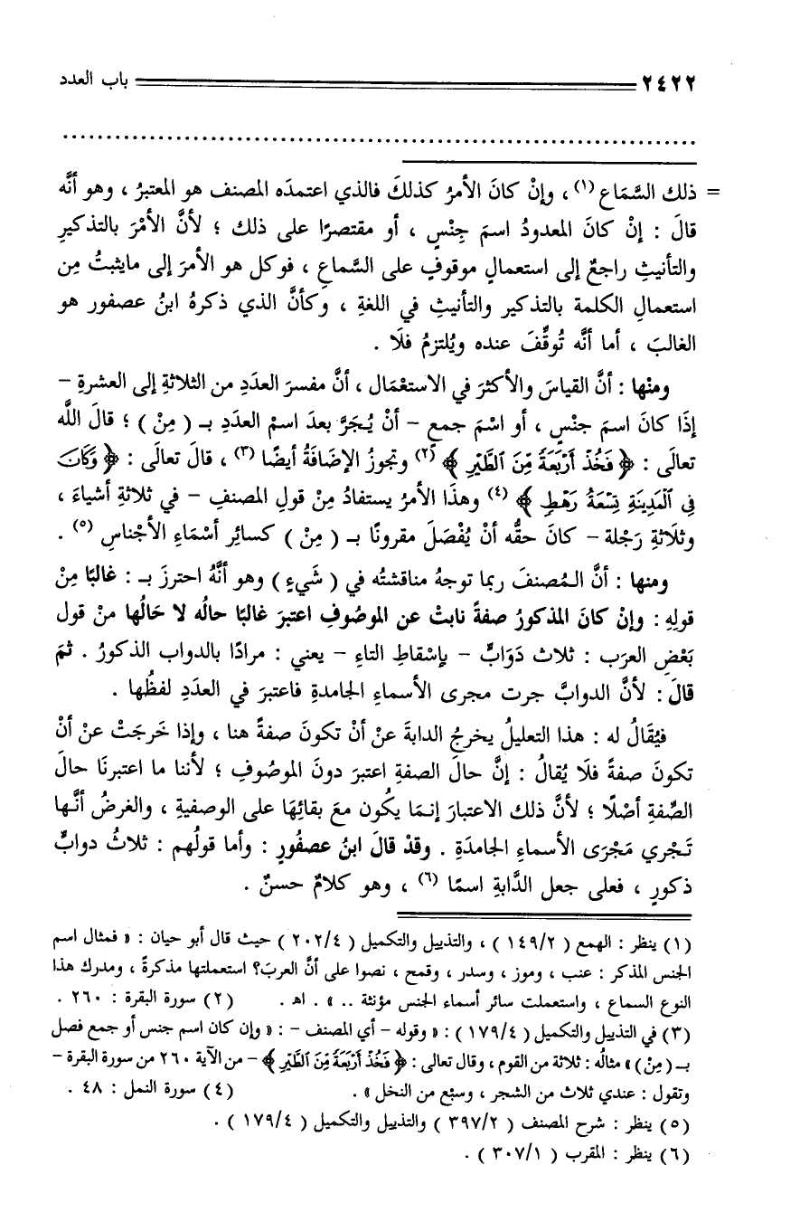 ومنها: أنّ القياس والأكثر في الاستعمال، أنّ مفسر العدد من الثلاثة إلى العشرة - إذا كان اسم جنس، أو اسم جمع - أن يجرّ بعد اسم العدد بـ (من)؛ قال الله تعالى: فَخُذْ أَرْبَعَةً مِنَ الطَّيْرِ (¬2) وتجوز الإضافة أيضا (¬3)، قال تعالى: وَكانَ فِي الْمَدِينَةِ تِسْعَةُ رَهْطٍ (¬4) وهذا الأمر يستفاد من قول المصنف - في ثلاثة أشياء، وثلاثة رجلة - كان حقّه أن يفصل مقرونا بـ (من) كسائر أسماء الأجناس (¬5).