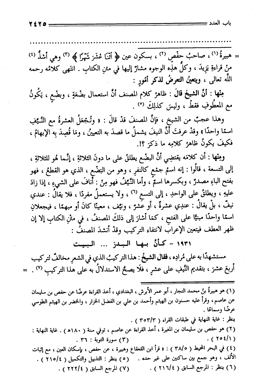 هبيرة (¬1)، صاحب حفص (¬2)، بسكون عين اثنا عشر شهرا (¬3) وهي أشذّ (¬4) من قراءة يزيد، وكلّ هذه الوجوه مشار إليها في متن الكتاب. انتهى كلامه رحمه الله تعالى، ويتعين التعرض لذكر أمور: