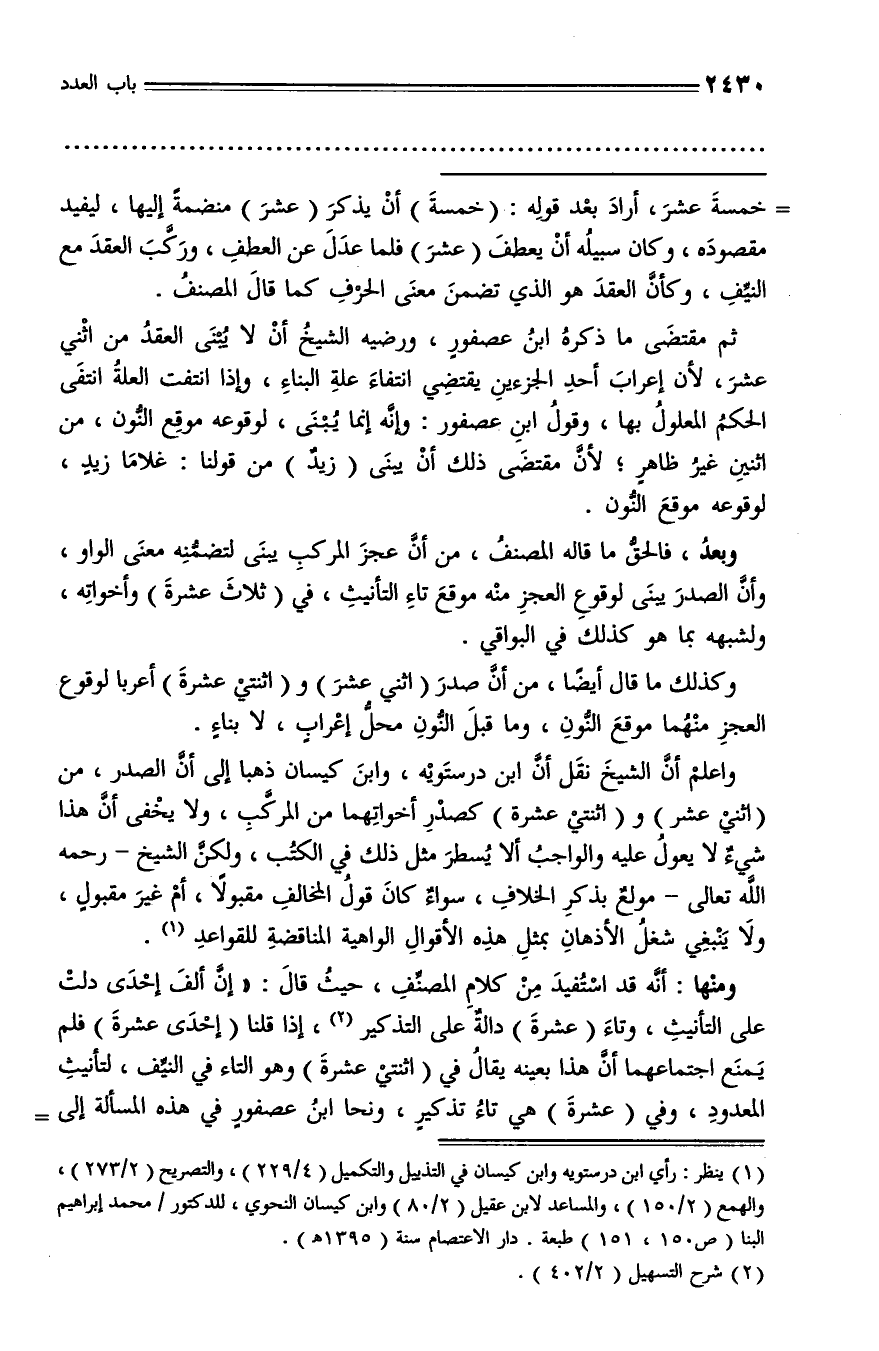 واعلم أنّ الشيخ نقل أنّ ابن درستويه، وابن كيسان ذهبا إلى أنّ الصدر، من (اثني عشر) و (اثنتي عشرة) كصدر أخواتهما من المركّب، ولا يخفى أنّ هذا شيء لا يعول عليه والواجب ألا يسطر مثل ذلك في الكتب، ولكنّ الشيخ - رحمه الله تعالى - مولع بذكر الخلاف، سواء كان قول المخالف مقبولا، أم غير مقبول، ولا ينبغي شغل الأذهان بمثل هذه الأقوال الواهية المناقضة للقواعد (¬1).