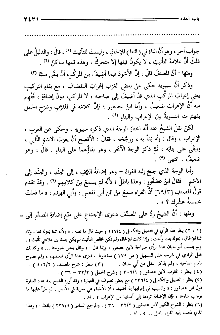 (¬5) ينظر: التذييل والتكميل (4/ 236) مع بعض تصرف في العبارة، وقد أورد الشيخ بعد هذه العبارة قول ابن عصفور: «والسبب في إعرابها إذا أضيفت أن الأشياء هي معربة في الأصل، ثم طرأ عليها ما يوجب بناءها، فإن الإضافة تردها إلى أصلها من الإعراب». اه.