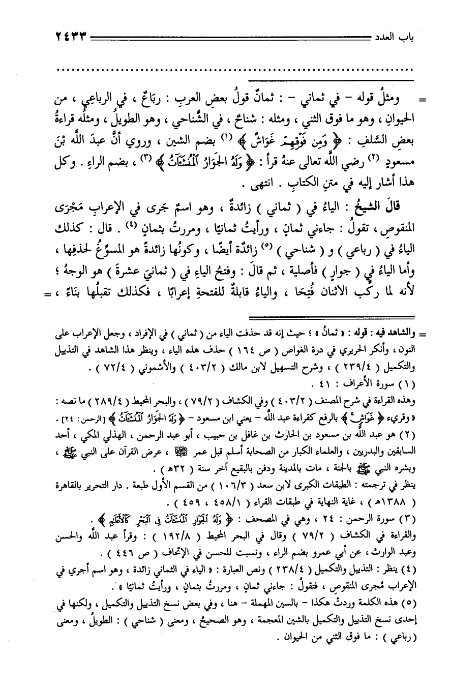 ومثل قوله - في ثماني -: ثمان قول بعض العرب: رباع، في الرباعي، من الحيوان، وهو ما فوق الثني، ومثله: شناح، في الشّناحي، وهو الطويل، ومثله قراءة بعض السّلف: ومن فوقهم غواش (¬1) بضم الشين، وروي أنّ عبد الله بن مسعود (¬2) رضي الله تعالى عنه قرأ: وله الجوار المنشئآت (¬3)، بضم الراء. وكل هذا أشار إليه في متن الكتاب. انتهى.
