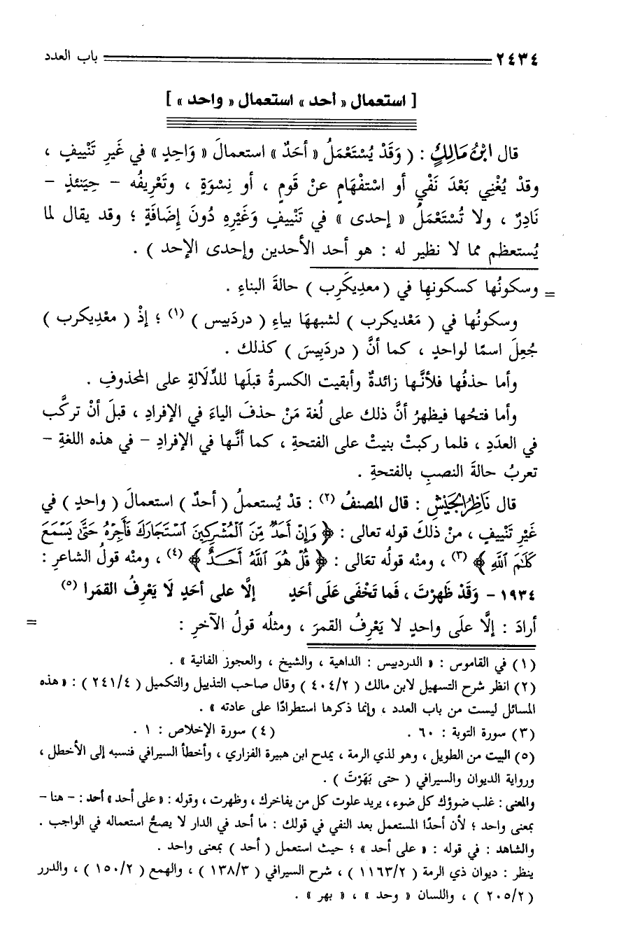 قال ناظر الجيش: قال المصنف (¬2): قد يستعمل (أحد) استعمال (واحد) في غير تنييف، من ذلك قوله تعالى: وَإِنْ أَحَدٌ مِنَ الْمُشْرِكِينَ اسْتَجارَكَ فَأَجِرْهُ حَتَّى يَسْمَعَ كَلامَ اللَّهِ (¬3)، ومنه قوله تعالى: قُلْ هُوَ اللَّهُ أَحَدٌ (¬4)، ومنه قول الشاعر: