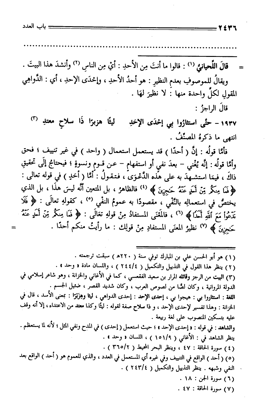 (¬5) (أحد) الواقع في التنييف وفي غيره أي المستعمل في العدد، والذي للعموم هو (أحد) الواقع بعد النفي وشبهه. ينظر التذييل والتكميل (4/ 243).