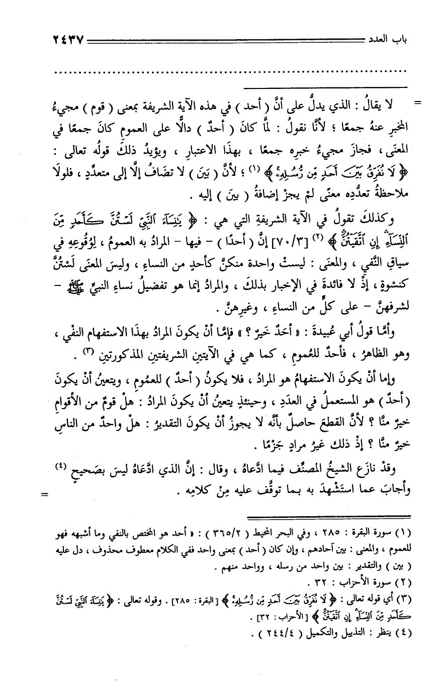 (¬3) أي قوله تعالى: لا نُفَرِّقُ بَيْنَ أَحَدٍ مِنْ رُسُلِهِ [البقرة: 285]. وقوله تعالى: يا نِساءَ النَّبِيِّ لَسْتُنَّ كَأَحَدٍ مِنَ النِّساءِ إِنِ اتَّقَيْتُنَّ [الأحزاب: 32].