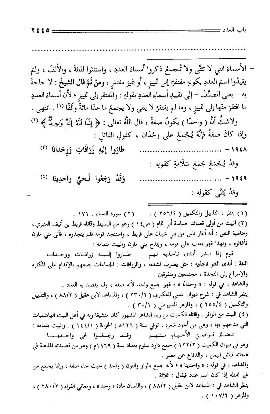 والشاهد: في قوله: «واحدينا»؛ لأنه جمع بالواو والنون (واحد) حيث جاء صفة، وإنما يجمع من غير لفظه إذا كان اسم عدد فيقال: ثلاثة.