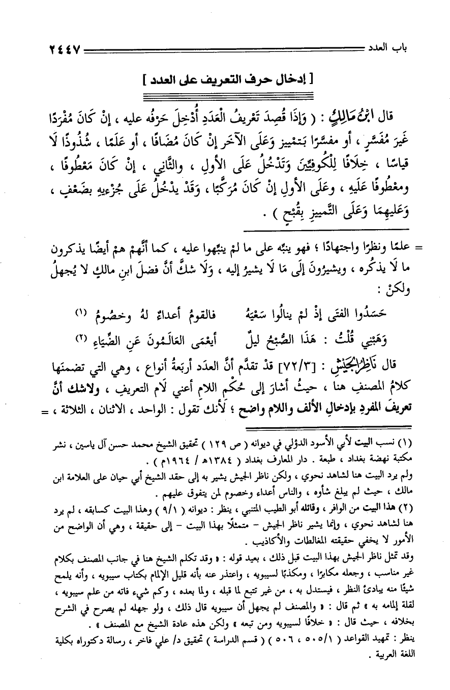 قال ابن مالك: (وإذا قصد تعريف العدد أدخل حرفه عليه، إن كان مفردا غير مفسّر، أو مفسّرا بتمييز وعلى الآخر إن كان مضافا، أو علما، شذوذا لا قياسا، خلافا للكوفيّين وتدخل على الأول، والثّاني، إن كان معطوفا، ومعطوفا عليه، وعلى الأول إن كان مركّبا، وقد يدخل على جزءيه بضعف، وعليهما وعلى التّمييز بقبح).