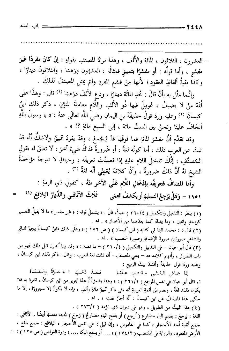 وقد تقدّم أنّ مفسّر المائة فما فوقها قد يجمع، وقد يفرد تمييزا ولا شكّ أنه قد ثبت عن العرب ذلك، أما كونه لغة، أو ضرورة فذاك شيء آخر، لا تعلق له بقول المصنّف: إنّك تدخل اللام عليه إذا قصدت تعريفه، وحينئذ لا تتوجه مؤاخذة الشيخ له أنّ ذلك ضرورة، وأنّ كلامه يعطي أنّه لغة (¬3).