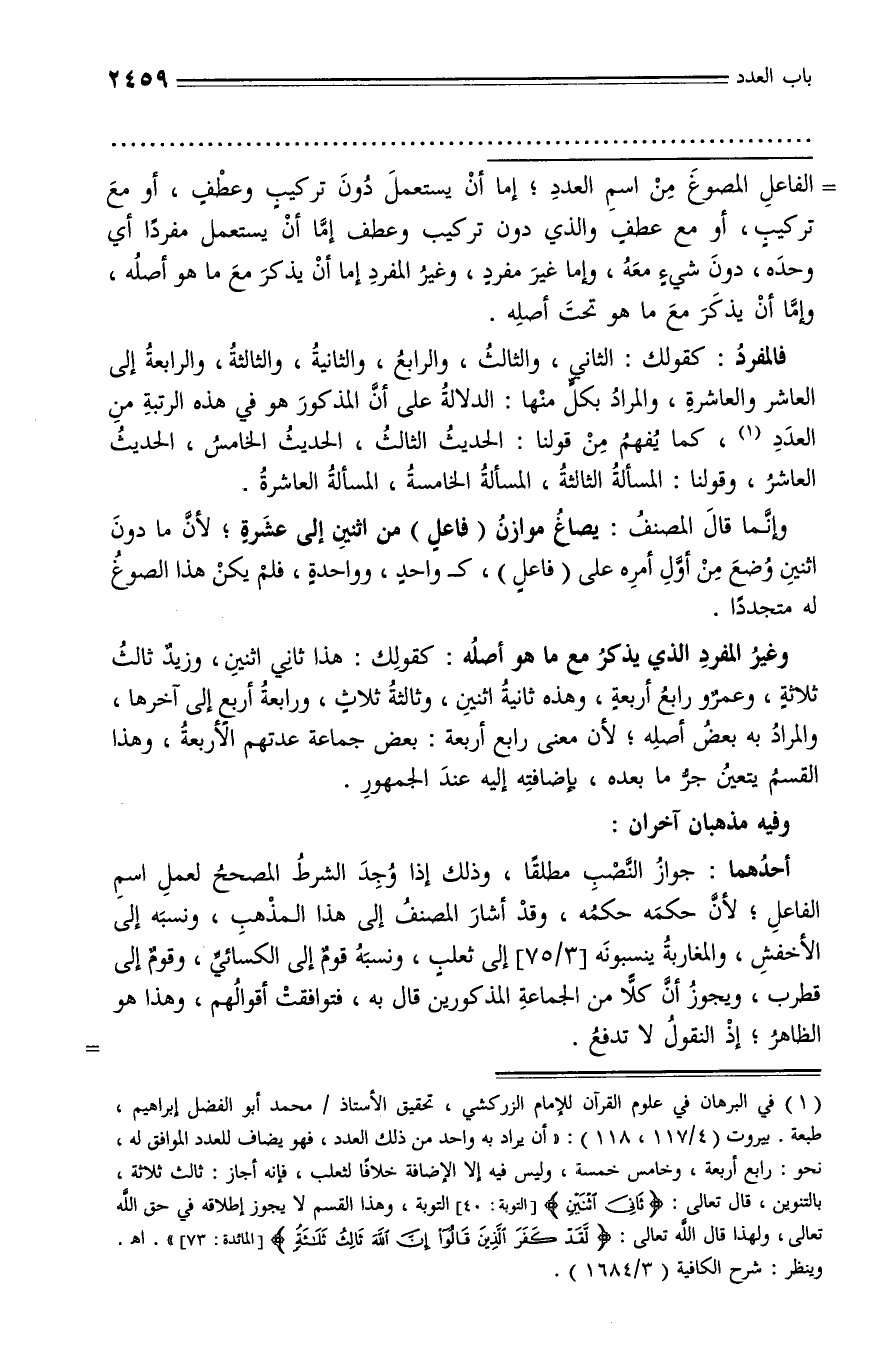 (¬1) في البرهان في علوم القرآن للإمام الزركشي، تحقيق الأستاذ/ محمد أبو الفضل إبراهيم، طبعة. بيروت (4/ 117، 118): «أن يراد به واحد من ذلك العدد، فهو يضاف للعدد الموافق له، نحو: رابع أربعة، وخامس خمسة، وليس فيه إلا الإضافة خلافا لثعلب، فإنه أجاز: ثالث ثلاثة، بالتنوين، قال تعالى: ثانِيَ اثْنَيْنِ [التوبة: 40] التوبة، وهذا القسم لا يجوز إطلاقه في حق الله تعالى، ولهذا قال الله تعالى: لَقَدْ كَفَرَ الَّذِينَ قالُوا إِنَّ اللَّهَ ثالِثُ ثَلاثَةٍ [المائدة: 73]». اه.