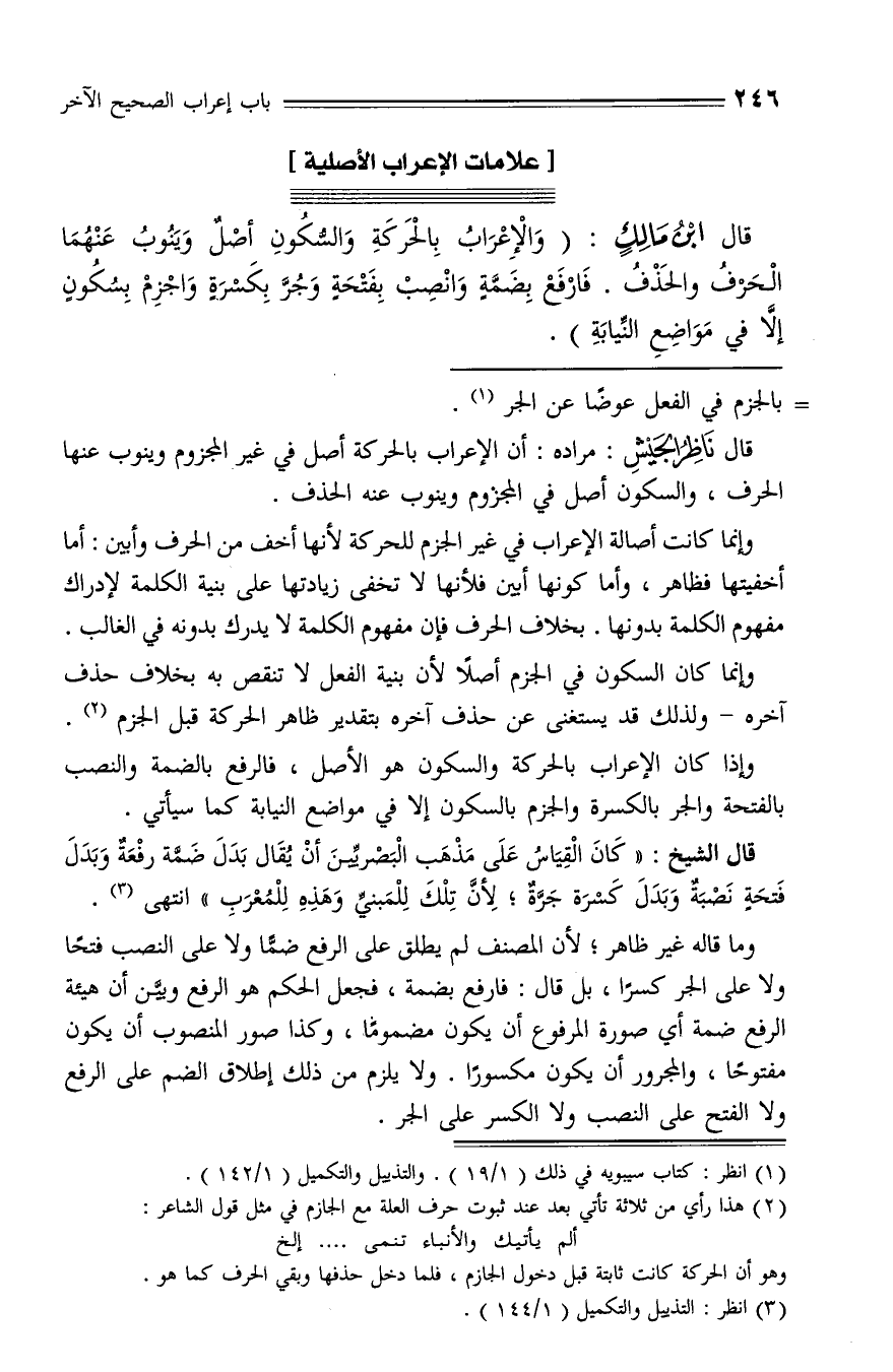 قال ناظر الجيش: مراده: أن الإعراب بالحركة أصل في غير المجزوم وينوب عنها الحرف، والسكون أصل في المجزوم وينوب عنه الحذف.