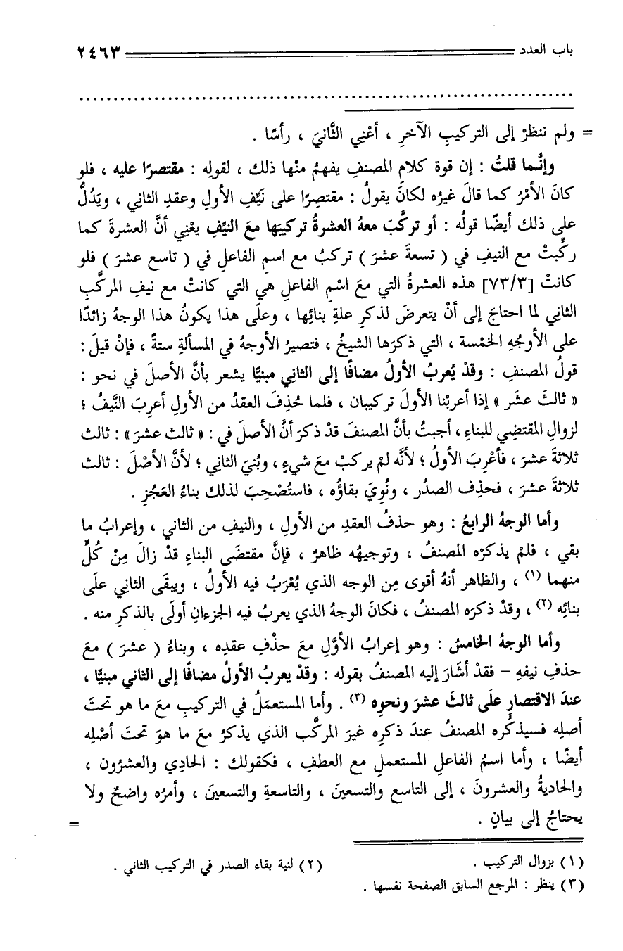 وإنّما قلت: إن قوة كلام المصنف يفهم منها ذلك، لقوله: مقتصرا عليه، فلو كان الأمر كما قال غيره لكان يقول: مقتصرا على نيّف الأول وعقد الثاني، ويدلّ على ذلك أيضا قوله: أو تركّب معه العشرة تركيبها مع النيّف يعني أنّ العشرة كما ركّبت مع النيف في (تسعة عشر) تركب مع اسم الفاعل في (تاسع عشر) فلو كانت [3/ 73] هذه العشرة التي مع اسم الفاعل هي التي كانت مع نيف المركّب الثاني لما احتاج إلى أن يتعرض لذكر علة بنائها، وعلى هذا يكون هذا الوجه زائدا على الأوجه الخمسة، التي ذكرها الشيخ، فتصير الأوجه في المسألة ستة، فإن قيل: